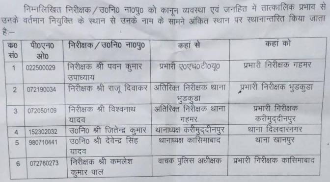गाजीपुर। नवागत पुलिस अधीक्षक रोहन पी बोत्रे ने शुक्रवार को कानून व्यवस्था को चुस्त-दुरुस्त बनाए रखने के लिए आधा दर्जन निरीक्षकों और उपनिरीक्षकों का फेरबदल किया। बता दें कि निरीक्षक पवन कुमार उपाध्याय को प्रभारी एएचटीयू से प्रभारी निरीक्षक गहमर, निरीक्षक राजू दिवाकर को अतिरिक्त निरीक्षक थाना भुड़कुड़ा से प्रभारी निरीक्षक भुड़कुड़ा, निरीक्षक विश्वनाथ यादव को अतिरिक्त निरीक्षक थाना गहमर से थाना प्रभारी करीमुद्दीनपुर, उप निरीक्षक जितेंद्र कुमार को थानाध्यक्ष करीमुद्दीनपुर से थाना दिलदारनगर, उप निरीक्षक देवेंद्र सिंह यादव को थानाध्यक्ष कासिमाबाद से थाना खानपुर और निरीक्षक कमलेश पाल को वाचक पुलिस अधीक्षक से प्रभारी निरीक्षक कासिमाबाद पद पर तैनात कर दिया है।