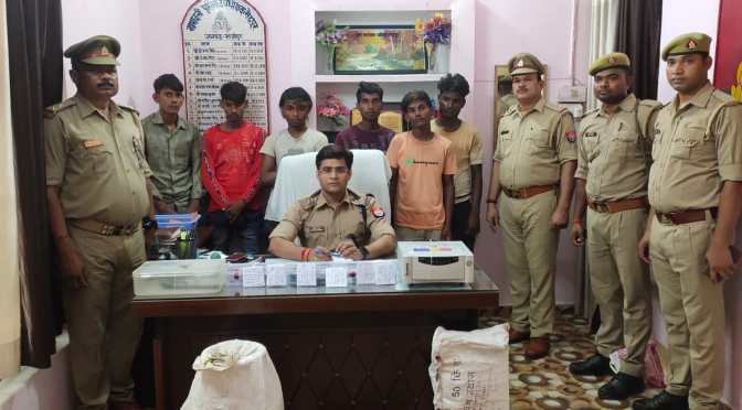 गाजीपुर। खानपुर पुलिस ने बेलहरी गांव की साईं की तकिया के पास से 6 चोरों को गिरफ्तार करने में सफलता हासिल की है।उनके पास से चार तमंचे व कारतूस व चोरी किए गए 6700 रुपये, इनवर्टर, बैट्री, एक सिलेंडर, एक चूल्हा बरामद किया।क्षेत्राधिकारी हितेंद्र कृष्णा ने बुधवार को अपने कार्यालय में प्रेसवार्ता आयोजित किया।पत्रकारो से रूबरू होते हुए बताया कि खानपुर थानाध्यक्ष संजय कुमार मिश्र वाहन चेकिंग कर रहे थे। सूचना मिली कि साईं की तकिया के पास कुछ संदिग्ध युवक खड़े हैं। पुलिस के पहुंचते ही सभी भागने लगे।घेराबंदी कर पुलिस ने उन्हें दबोच लिया।गिरफ्तार किए गए अभियुक्त हेमंत कुमार, सन्नी, विवेक उर्फ बुच्ची, विशाल कुमार, अविनाश व अभिषेक कुमार बेलहरी गांव के बस्ती के हैं और इन्होंने कई जिलों में चोरी की घटनाओं को अंजाम दिया है जिनके खिलाफ कई मुकदमे विभिन्न थानों में दर्ज है। सभी चोरों की निशानदेही पर पुलिस ने इनवर्टर, बैट्री, खाली सिलेंडर, चूल्हा आदि बरामद किया है।
