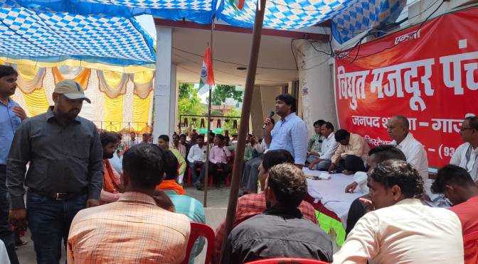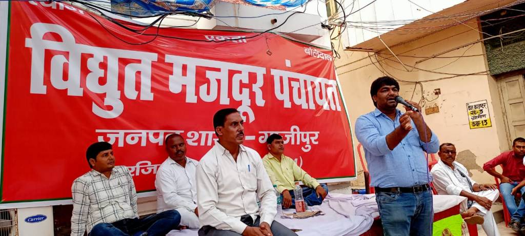 गाजीपुर। विद्युत वितरण खण्ड द्युतीय आमघाट के प्रांगण में विद्युतकर्मियो के द्वारा बुधवार को विशाल धरना प्रदर्शन किया गया। जिसमें जिले के समस्त संविदा कर्मी, मीटर रीडर, कम्प्यूटर ऑपरेटर ने अपने मांगो एव नियमित मजदूरी को लेकर धरना दिया। इस दौरान विद्युत मजदूर पंचायत के जिलाध्यक्ष अरविंद कुशवाहा ने धरने को संबोधित करते हुवे बताया कि पिछले तीन महीने से मीटर रीडरों का मानदेय नही मिला है एव पिछले एक साल से किसी भी रीडरों का पीएफ एव ईएसआई नही कटा है जो कहि ना कहि मेसर्स स्टर्लिंग कंपनी भ्रस्टाचार में लिप्त हैं, जिसकी जांच सूबे के मुख्यमंत्री के साथ साथ पावर कारपोरेशन के चैयरमेन से विद्युत मजदूर पंचायत करवाएगा, ताकि हकीकत पता चले की इस गरीब मजदूरों का पैसा कौन मार रहा है। यही नही जिले में मेन्टेन्स का कार्य करवा रही भारत इंटरप्राइजेज का भी शिकायत मुख्यमंत्री से करना है जो गरीब संविदाकर्मियों का पिछले चार महीने से किसी के दस महीने का अभी तक मानदेय नही दिया है और ना ही किसी का पीएफ एकाउंट किसी संविदा कर्मी को दिया। जो जांच का विषय है।