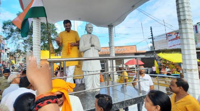 गाजीपुर।विधान परिषद सदस्य विशाल सिंह चंचल ने आजादी के 75 वें वर्ष के अमृत महोत्सव कार्यक्रम मे शीर्ष संगठन द्वारा आयोजित कार्यक्रम मे गुरुवार को मिश्रबाजार स्थित पं दीनदयाल उपाध्याय के प्रतिमा पर माल्यार्पण कर उनके द्वारा देश और समाज के लिए किए कार्यों,उनकी एकात्म मानववाद की सोच तथा बलिदान को याद कर नत मस्तक नमन किया।इस दौरान एमएलसी विशाल सिंह चंचल ने कहा कि यह देश महापुरुषों तथा बलिदानियों का है। जिन्होंने समय-समय पर अपने कार्यों एवं सोच से समाज को जागृत तथा देश को मजबूत किया है।आज देश को आजाद हुए 75 वर्ष पूर्ण होने पर देशवासी स्वतंत्रता संग्राम मे समर्पित होकर कार्य करने तथा समाज को मजबूती प्रदान कर देश की एकता अखंडता को अच्छुण रखा है।नगरपालिका अध्यक्ष सरिता अग्रवाल ने आमघाट पार्क स्थित महात्मा गांधी के प्रतिमा पर माल्यार्पण कर देश प्रेम के नारे लगाए और कहा कि देश के क्रांतिकारी नवजवानों,स्वतंत्रता संग्राम सेनानी, महापुरुषों के बलिदान ने हमे आजादी दिलाई हम उनके सम्मान मे सदैव नतमस्तक रहेंगे।इस अवसर पर ब्लाक प्रमुख राजन सिंह,विनोद अग्रवाल,अभिनव सिंह छोटू,डा प्रदीप पाठक,गुलाम कादिर राइनी,शैलैश राम, सोमेश राय,साधना राय,विश्वप्रकाश अकेला,किरन सिंह,सीमा मिश्रा,विशाल चौरसिया,संतोष जायसवाल, सुनिता सिंह,हिमांशु सिंह,रूपक तिवारी आदि उपस्थित थे।