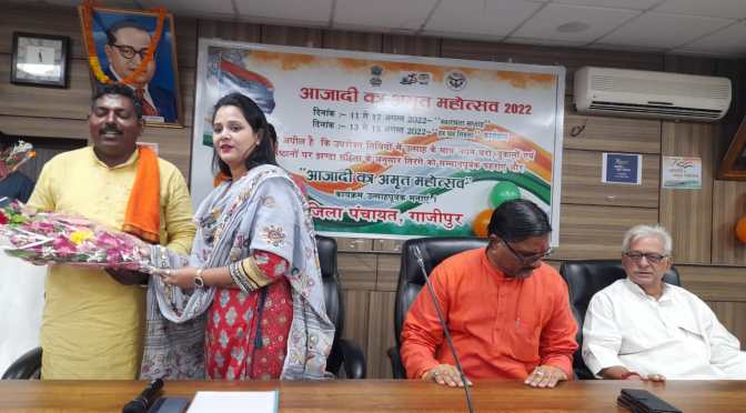 गाजीपुर।जिला पंचायत वार्ड संख्या 41 करंडा द्वितीय के उप चुनाव मे नवनिर्वाचित जिला पंचायत सदस्य शैलेश कुमार राम को जिला पंचायत अध्यक्ष सपना सिंह ने जिला पंचायत हाल मे भाजपा जिलाध्यक्ष भानूप्रताप सिंह,विजय शंकर राय,पूर्व विधायक कालीचरण राजभर, पंचायत सदस्यों एवं अन्य अतिथियों सहित जिला पंचायत के अधिकारियों के उपस्थिति मे पद निष्ठा एवं गोपनीयता की शपथ सादे समारोह मे दिलाई गई। जिला पंचायत अध्यक्ष सपना सिंह ने शपथ दिलाने के बाद पुष्प गुच्छ लेकर सम्मानित सदस्य को अपने परिवार मे शामिल होने कि बधाई दी और कहा कि गाजीपुर जिला पंचायत हर बाधाओं को दूर कर विकास का नया मानक स्थापित करेगी और पुरे प्रदेश मे एक आदर्श जिला पंचायत के रुप मे जानी जाएगी।