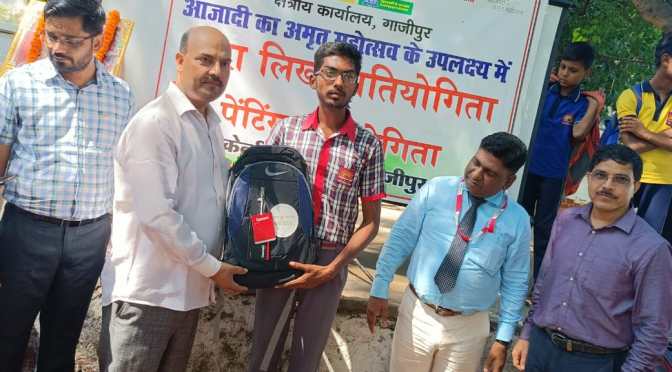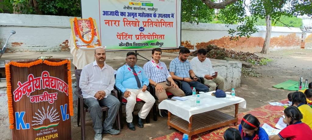 आज की यह प्रतियोगिता दो वर्गों में आयोजित की गई थी। कनिष्ठ वर्ग, कक्षा 6 से 8 के लिए नारा लेखन प्रतियोगिता जिसका विषय था “आजादी के नारे” आयोजित की गई जिसमें लगभग 110 बच्चों ने प्रतिभाग किया। वहीं वरिष्ठ वर्ग कक्षा 9 से 12 के लिए पोस्टर मेकिंग प्रतियोगिता जिसका विषय था “भारतीय स्वतंत्रता संग्राम की ऐतिहासिक घटनाएं” अथवा “भारतीय स्वतंत्रता आंदोलन के सेनानी” (दोनों में से कोई एक) आयोजित की गई जिसमें 85 विद्यार्थियों ने प्रतिभाग किया। प्रतियोगिता में उत्कृष्ट प्रदर्शन करने वाले विद्यार्थियों को सुनील कुमार, उप-क्षेत्र प्रमुख, यूनियन बैंक ऑफ इंडिया, तथा मुकेश कुमार वर्मा, प्राचार्य केन्द्रीय विद्यालय गाजीपुर ने पारितोषिक प्रदान कर सम्मानित किया। कनिष्ठ वर्ग में क्रमशः जीनत खातून कक्षा 6, स्वाती जायसवाल कक्षा 7 तथा आंचल पासवान कक्षा 8 एवं वरिष्ठ वर्ग में शिवांशु कुशवाहा कक्षा 11, खुशी कुशवाहा कक्षा 11 तथा अभ्युदय वर्मा कक्षा 12 को पुरस्कार प्रदान किया गया। सम्पूर्ण कार्यक्रम का संयोजन नीरज राय केन्द्रीय विद्यालय गाजीपुर तथा विकाश उपाध्याय, सतर्कता अधिकारी यूनियन बैंक ऑफ इंडिया गाजीपुर ने किया। इस अवसर पर राजभाषा अधिकारी अनुराग कुमार सिंह ने बताया कि 14-15 सितंबर 2022 को गुजरात के सूरत में आयोजित हो रहे दूसरे अखिल भारतीय राजभाषा सम्मेलन में नगर राजभाषा कार्यान्वयन समिति, गाजीपुर की ओर से अनुराग कुमार सिंह, नीरज राय, पंकज कुशवाहा सहित नराकास गाजीपुर के अन्य केन्द्रीय कार्यालयों से भी कुछ सदस्य सम्मिलित होने के लिए सूरत जाएंगे। इस सम्मेलन में माननीय गृहमंत्री, भारत सरकार अमित शाह के साथ-साथ स्वयं प्रधानमंत्री नरेन्द्र मोदी जी भी उपस्थित रहेंगे। कार्यक्रम का सफल संचालन केन्द्रीय विद्यालय गाजीपुर के वरिष्ठ शिक्षक तथा हिन्दी प्रवक्ता नीरज राय ने तथा धन्यवाद ज्ञापन कला शिक्षक बाल चंद्र राम ने किया। कार्यक्रम में राजेन्द्र कुमार यादव, सुरक्षा अधिकारी यूनियन बैंक ऑफ इंडिया, केन्द्रीय विद्यालय गाजीपुर के आलोक कुमार राय, जितेन्द्र कुमार तिवारी, मनीष आर्या, शिवप्रकाश, अवशेष प्रकाश, अनामिका, केशव सिंह, पंकज कुशवाहा आदि शिक्षक तथा विद्यार्थी उपस्थित हुए।