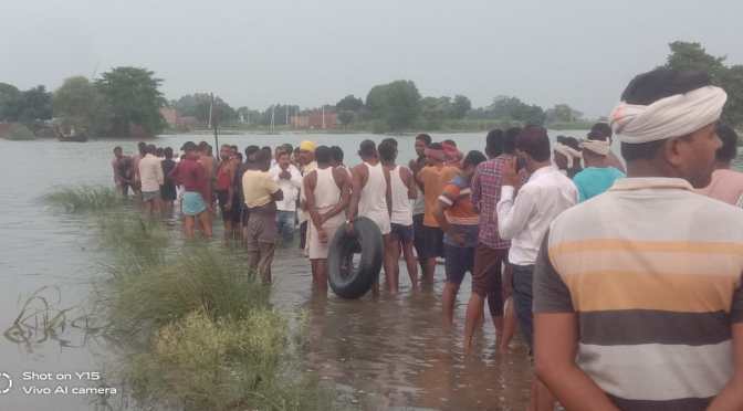 गाज़ीपुर।सेवराई तहसील क्षेत्र के अठ्ठहठा गांव में बाढ़ पीड़ितों को ले जा रही नाव डूबने से दो लोगों की मौत हो गई तो वही 5 लोगों के पानी में लापता होने का समाचार प्राप्त हुआ है । जानकारी अनुसार तहसील क्षेत्र के अठ्ठहठा गांव में प्रशासन की तरफ से लोगों के आवागमन के लिए नाव की व्यवस्था की गई थी । चश्मदीदों के मुताबिक इस मझली नाव में करीब 35 की संख्या में लोग पशुओं का चारा सहित अन्य घरेलू सामान लेकर बैठे थे जैसे ही नाव खुली और 100 मीटर आगे बढ़ी कि नाव का जनरेटर बंद हो गया और ओवरलोड होने के कारण नाव में पानी भरने लगा। इस अफरातफरी में लोग नाव से पानी में कूदने लगे जिसमें गांव के डब्लू गौण (40) नगीना (72) एवं नाव चला रहे नाविक गहरे पानी में जाने लगे कुछ देर बाद ग्रामीणों द्वारा इन तीनों को तो निकाल लिया गया । वही रास्ते में इलाज के लिए अस्पताल ले जाते समय डब्ल्यू गौड़और नगीना की मृत्यु हो गई । वही गांव के तीन लड़के और दो लड़कीयो का अभी तक कोई पता नही चल सका है घटना की सूचना मिलते ही जिला प्रशासन हरकत में आया। मौके पर एडीएम एसडीएम सहित स्वास्थ्य विभाग की टीम पहुंची ।पीएसी के गोताखोरों द्वारा डूबे लोगों की खोजबीन की जा रही थी।