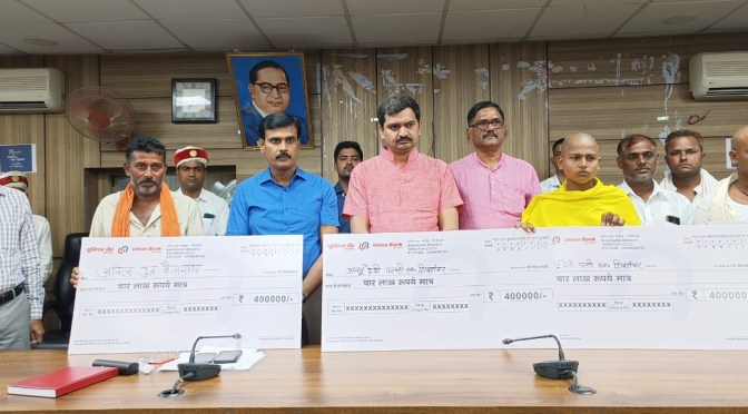 गाजीपुर। जिला पंचायत सभागार में जिलाधिकारी मंगला प्रसाद सिंह की उपस्थिति में 31 अगस्त की शाम ग्राम अठहठा विकास खण्ड रेवतीपुर, तहसील सेवराई में एक बड़ी नॉव दुघर्टना हुई थी, जिसमें 2 व्यकित्यों को अस्पताल ले जाते समय मृत्यु हो गयी थी। 5 व्यक्ति लापता हो गए थे। जिनकी डेड बाड़ी गोताखोरो एवं एन.डी.आर.एफ की टीम ने अगले दिन 1 सितम्बर को खोज कर निकाला। सबका पोस्टमार्टम कराने के उपरान्त गुरुवार की शाम को ही सबका सःसम्मान अन्त्येष्ठि क्रिया सम्पन्न की गई। जिसको लेकर राज्य सरकार की ओर से एमएलसी विशाल सिंह चंचल एवं जनप्रतिनिधियों के साथ जिला पंचायत सभागार में शुक्रवार को उन प्रभावित परिवारों को 4-4 लाख की आर्थिक मदद दी गई।