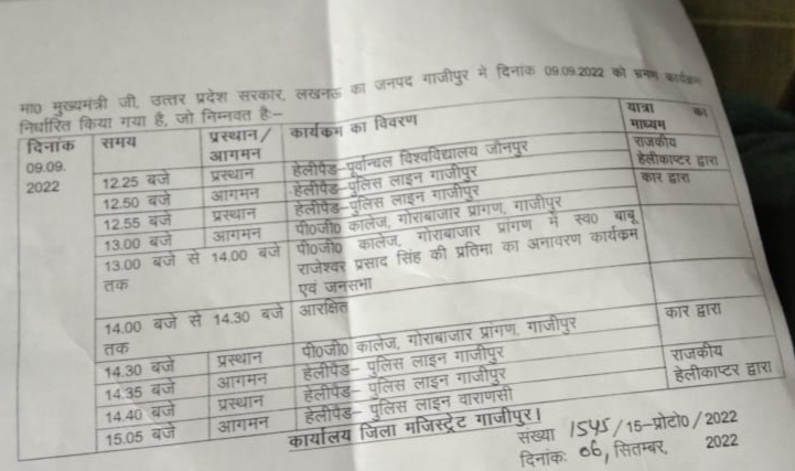 गाजीपुर। जिला मजिस्ट्रेट मंगला प्रसाद सिंह ने बताया है कि मुख्यमंत्री योगी आदित्यनाथ 9 सितम्बर को जौनपुर से प्रस्थान कर समय 12ः50 बजे जनपद गाजीपुर में राजकीय हेलीकाप्टर द्वारा पुलिस लाईन पहुचेगे उसके उपरान्त 1 बजे कार द्वारा पी0जी0 कालेज, गोराबाजार प्रांगण में स्व0 बाबू राजेश्वर प्रसाद सिंह की प्रतिमा का अनावरण कार्यक्रम में प्रतिभाग एवं जनसभा करेंगे। इसके उपरान्त 2ः40 हेलीपैड-पुलिस लाईन पहुचकर राजकीय हेलीकाप्टर द्वारा वाराणसी को प्रस्थान करेगे।