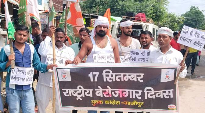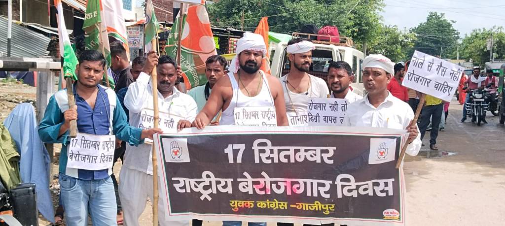गाजीपुर। 17 सितंबर को जहां प्रधानमंत्री नरेन्द्र मोदी का जन्मदिन मनाया जा रहा था वहीं शनिवार को उत्तर प्रदेश युवा कांग्रेस द्वारा प्रदेश भर में बेरोजगारी दिवस मनाया जा रहा था। इसी क्रम में शनिवार को जिला युवा कांग्रेस के महासचिव जावेद आलम के नेतृत्व में दुल्लहपुर क्षेत्र में भीक्षा टन एवं बेरोजगारी मार्च निकालकर प्रदर्शन किया गया। इस बेरोजगारी मार्च में मुख्य अतिथि के रूप में भारतीय युवा कांग्रेस के प्रदेश सचिव दिवांशु पाण्डेय एवं युवा सेवादल के जिलाअध्यक्ष आशुतोष गुप्ता मौजूद रहे। बेरोजगारी मार्च दुल्लहपुर चौहान बाजार से शुरू होकर सब्जी मंडी तक निकाला गया। इस मौके पर युवा कांग्रेस के पदाधिकारियों ने देश औऱ प्रदेश की भाजपा सरकार को देश के युवाओं के साथ छल करने व युवा विरोधी होने का आरोप लगाते हुए सरकार विरोधी नारेबाजी की।