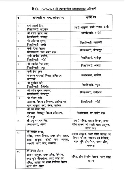 लखनऊ। प्रदेश सरकार ने शनिवार की देर रात जिलाधिकारी सहित 14 आइएएस अफसरों के तबादले कर दिए। सात जिलाधिकारियों को योगी सरकार ने दूसरे जिलों में फिर से जिलाधिकारी बना दिया है। हरदोई, बाराबंकी, मीरजापुर, गाजीपुर, आगरा, चंदौली, मथुरा, पीलीभीत, भदोही व संतकबीरनगर में नए जिलाधिकारी तैनात कर दिए गए हैं।