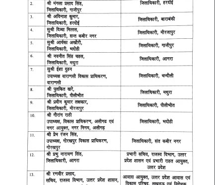 लखनऊ। प्रदेश सरकार ने शनिवार की देर रात जिलाधिकारी सहित 14 आइएएस अफसरों के तबादले कर दिए। सात जिलाधिकारियों को योगी सरकार ने दूसरे जिलों में फिर से जिलाधिकारी बना दिया है। हरदोई, बाराबंकी, मीरजापुर, गाजीपुर, आगरा, चंदौली, मथुरा, पीलीभीत, भदोही व संतकबीरनगर में नए जिलाधिकारी तैनात कर दिए गए हैं।