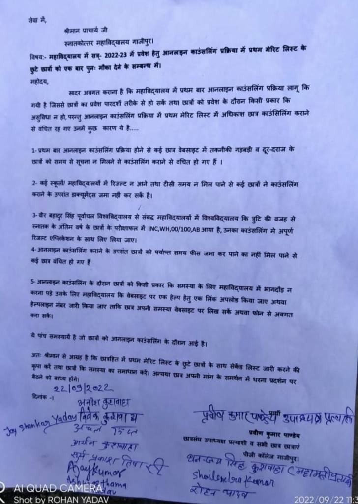 गाजीपुर। छात्र संघ उपाध्यक्ष प्रत्याशी प्रवीण पाण्डेय के नेतृत्व में छात्रों ने पीजी कॉलेज के प्राचार्य डॉ राघवेन्द्र पाण्डेय को आनलाइन काउंसलिंग के दौरान हो रही वेबसाइट में समस्या को लेकर गुरुवार को पत्रक सौंपा। छात्र नेता प्रवीण पाण्डेय ने कहा कि महाविद्यालय में प्रथम बार आनलाइन काउंसलिंग प्रक्रिया लागू कि गयी है जिससे प्रवेश प्रक्रिया में पारदर्शिता आयें। किन्तु वेबसाइट कि तकनीकी गड़बड़ी के कारण कुछ छात्रों कि काउंसलिंग नहीं हो सकी है और वह प्रवेश लेने से वंचित हो गए हैं। कुछ छात्रों कि फीस फस गई है तथा स्कूल व महाविद्यालय में रिजल्ट न आने से टीसी नहीं मिल रही, जिससे सम्पूर्ण डाक्यूमेंट्स न होने पर काउंसलिंग से बाहर कर दिया जा रहा है। पत्रक में पुनः एक बार छात्रों को मौका देंने की मांग की गई है, यदि छात्रों कि मांग कि अनदेखी की गई तो छात्र धरना प्रदर्शन पर बैठने को बाध्य होंगे। जिसकी सम्पूर्ण जिम्मेदारी महाविद्यालय प्रशासन की होगी। इस मौके पर प्रवीण कुमार पांडेय, रोहन यादव, सत्या प्रजापति, आंचल गुप्ता, आर्यन कुशवाहा, सूर्य प्रकाश तिवारी, धनंजय कुशवाहा, अभिषेक यादव, जयशंकर कुमार, अजय कुमार, अनीष कुशवाहा, प्रिंस प्रजापति सहित इत्यादि छात्र मौजूद थे।