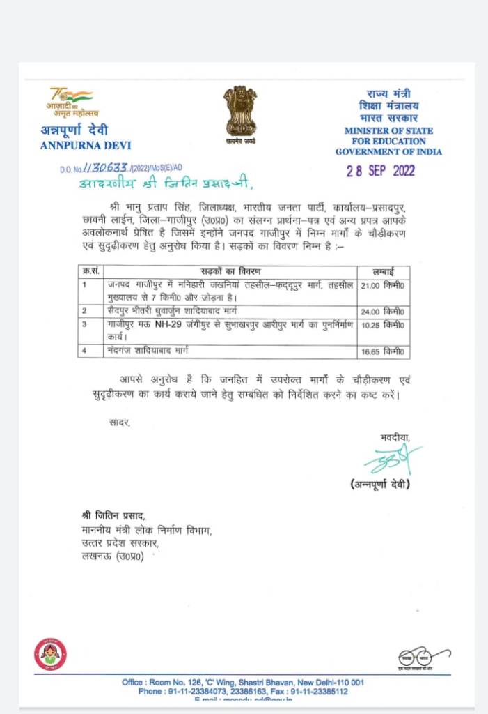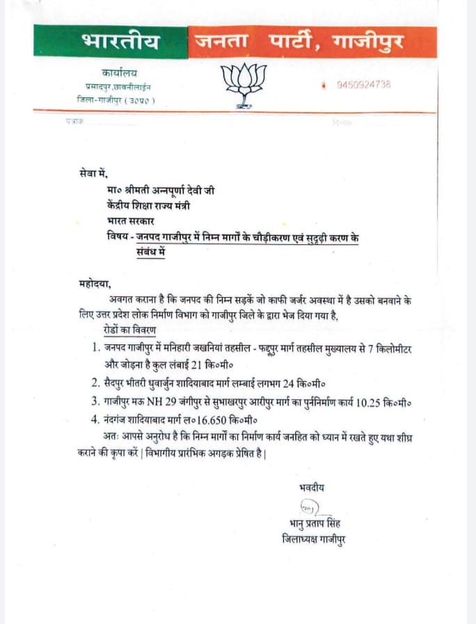 गाजीपुर। भाजपा जिलाध्यक्ष भानुप्रताप सिंह ने लोकसभा की प्रवासी केन्द्रीय शिक्षा राज्य मंत्री अन्नपूर्णा देवी को पत्र लिखकर जिले के चार प्रमुख महत्वपूर्ण मार्गों मनिहारी -जखनियाँ तहसील होते फद्दूपुर मार्ग लगभग 21 किमी, सैदपुर से भितरी, धुवार्जुन होते शादियाबाद मार्ग, लगभग 24 किमी, राष्ट्रीय राजमार्ग 29 जंगीपुर, लावा मोड़ से वाया सुभाखरपुर आरीपुर मार्ग लम्बाई 10.25 किमी, नन्दगंज से शादियाबाद मार्ग 16.65 किमी जो जर्जर और गड्ढों के कारण दुर्गम है। उनके सुदृढीकरण एवं चौड़ीकरण हेतु कहा था। उस पर तत्काल प्रभाव से मंत्री अन्नपूर्णा देवी ने संज्ञान लेकर उत्तर प्रदेश सरकार के लोक निर्माण मंत्री जितिन प्रसाद से वार्ता कर उन्हें पत्र लिखकर इसके त्वरित निर्माण को कहा है। भाजपा जिला मीडिया प्रभारी शशिकान्त शर्मा ने विज्ञप्ति के माध्यम से यह जानकारी देते हुए बताया कि इस आशय की जानकारी स्वयं केन्द्रीय मंत्री अन्नपूर्णा देवी ने जिलाध्यक्ष भानुप्रताप सिंह को फोन करके बताते हुए कहा कि लोक निर्माण मंत्री जितिन प्रसाद ने इस पर अतिशीघ्र कार्यवाही का भरोसा दिया है।