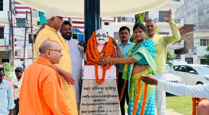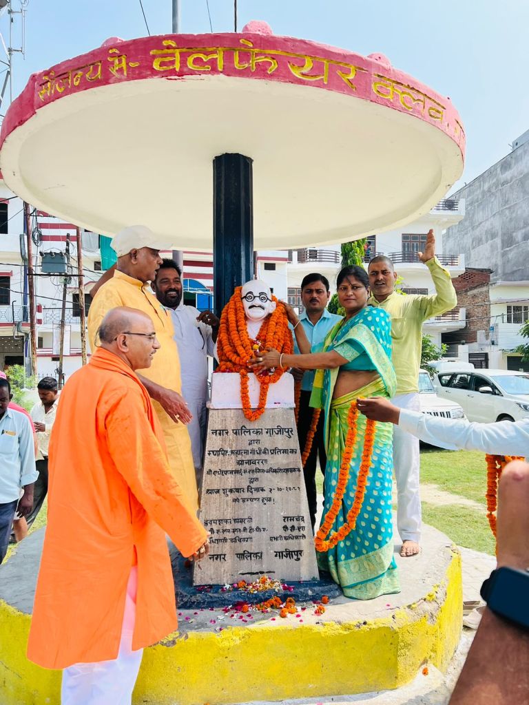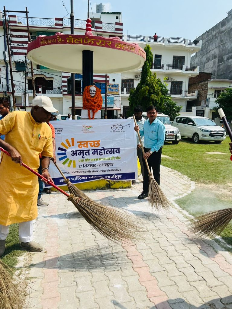 गाजीपुर। महात्मा गाँधी व लाल बहादुर शास्त्री के जयंती के अवसर पर नगर पालिका परिषद कार्यालय परिसर में झंडारोहण कर गोष्ठी का आयोजन किया गया। इस मौके पर नगर पालिका परिषद अध्यक्ष सरिता अग्रवाल, नगर पालिका परिषद पूर्व अध्यक्ष विनोद अग्रवाल व अधिशासी अधिकारी लालचंद सरोज ने महात्मा गाँधी और लाल बहादुर शास्त्री के चित्र पर माल्यार्पण करते हुए श्रद्धासुमन अर्पित किया। पालिकाध्यक्ष सरिता अग्रवाल ने दोनों महापुरुषों के जीवन संघर्ष, उनकी देश सेवा, उनके जीवन मूल्यों पर प्रकाश डालते हुए कहा कि जिस प्रकार महात्मा गांधी ने स्वच्छता पर विशेष ध्यान दिया उसी प्रकार हमारे प्रधानमन्त्री ने आम जनमानस के छोटे-छोटे बिंदुओं पर विशेष ध्यान दे रहे हैं। विनोद अगवाल एवं लालचन्द सरोज ने अपना-अपना संबोधन दिया। इस मौके पर सभासद/प्रतिनिधि दिग्विजय पासवान, अमरनाथ दुबे, समरेंद्र सिंह, अर्जुन सेठ, कमलेश बिंद, सोमेश मोहन राय, रूपक तिवारी, परवेज अहम, हरिलाल गुप्ता, सुशील वर्मा, शेषनाथ यादव के अलावा जेई जल रफीउल्लाह खां, सफाई एवं खाद्य निरीक्षक मो० एहसान आलम एवं समन्वयक संत कुमार आदि सहित कर्मचारीगण उपस्थित थे। गोष्ठी कार्यक्रम के उपरान्त नगर पालिका परिषद, गाजीपुर सीमांतर्गत में जगह-जगह महापुरुषों की मूर्तियों पर माल्यार्पण करते हुए। आमघाट पार्क में महात्मा गांधी की मूर्ति पर माल्यार्पण किया गया। साथ ही स्वच्छ अमृत महोत्सव के तहत पार्क में स्वच्छता के लिए झाड़ू लगाया गया।