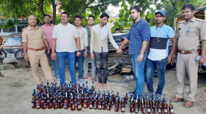 तो बैरिकेडिंग को तोड़कर भागने के प्रयास में अभियुक्त की गाड़ी डिवाइडर से टकरा गई और गाड़ी रुक गई अभियुक्त को गिरफ्तार किया गया, नाम पता पूछने पर अपना नाम मिथुन पांडेय पुत्र स्व. बृजनाथ पांडेय ग्राम सिधई थाना सहतवार जनपद बलिया बताया तथा भागने का कारण पूछा गया, तो बताया कि हरियाणा से अंग्रेजी शराब लेकर बिहार में बेचता हूं, गाजीपुर होकर भरौली रास्ते से बिहार जाने वाला था, गाड़ी में हमारे सीट के नीचे तक खाना बना है तथा पीछे वाली सीट के नीचे तक खाना बना है, उसी में शराब की बोतलें रखा हूं, अभी उसके बताने के अनुसार ड्राइवर की सीट के नीचे और पीछे वाली सीट उठाकर देखा गया, तो नीचे अलग से तहखाना बना हुआ है, जिसमें अंग्रेजी शराब की छोटी व बड़ी बोतलें रखी हुई है, जिसे बाहर निकाल कर देखा गया, तो अंग्रेजी की बड़ी बोतलें मेड इन हरियाणा फॉर सेल इन हरियाणा वनली का लेबल चस्पा है। कुल 51 बोतलें 750ml व छोटी बोतल पर भी यही लिखा है। कुल 63 बोतले 375 ML की। कुल मिलाकर 144 बोतले अवैध शराब मिली। अवैध शराब को कब्जा में लेते हुए पुलिस ने अभियुक्तों द्वारा ले जाने में प्रयुक्त गाड़ी नंबर यूपी 78 बीआर 786 को भी कब्जा में लिया। अभियुक्त को विधि प्रक्रिया में न्यायालय रवाना किया गया। गिरफ्तार करने वाली टीम में प्रभारी निरीक्षक शीतल चन्द्र थाना बिरनो, एसओजी प्रभारी रामाश्रय राय, उ.नि. सुरेन्द्र कुमार, का. अशोक कुमार निर्मल, रजनीश भार्गव, विनय यादव, चन्दन मणि त्रिपाठी, राकेश सोनकर, प्रमोद कुमार सरोज, संजय प्रसाद आदि शामिल रहे।