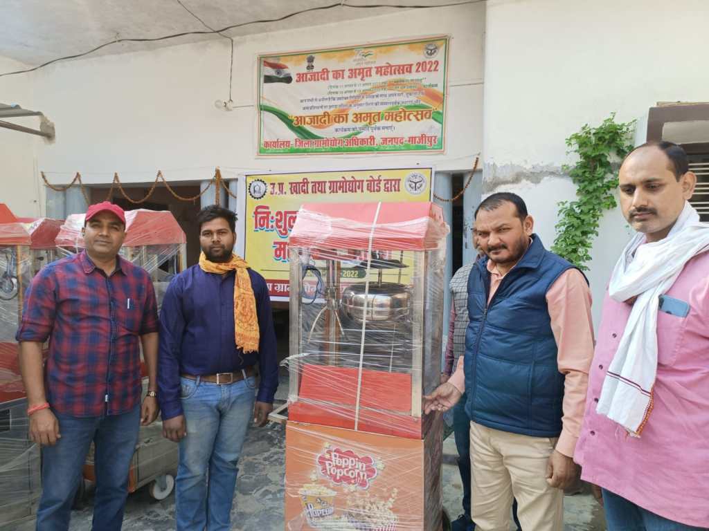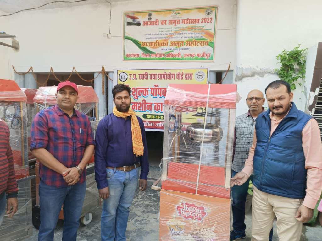 गाजीपुर। शनिवार को जनपद में जिला ग्रामोद्योग अधिकारी बी.के. सिंह के द्वारा बेरोजगार युवकों को पॉपकॉर्न मशीन का वितरण किया गया ।