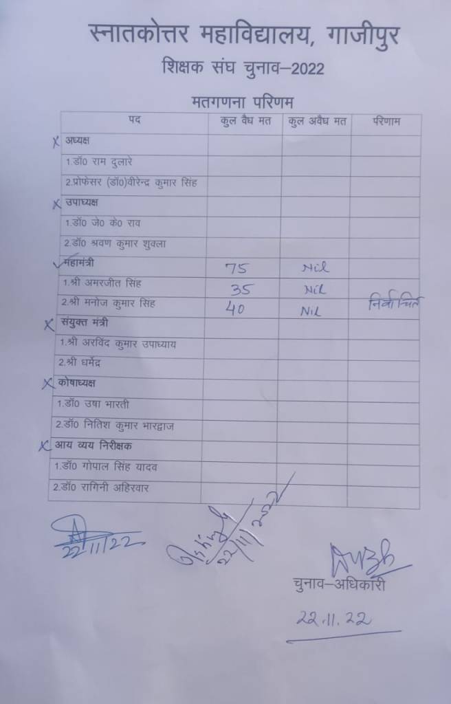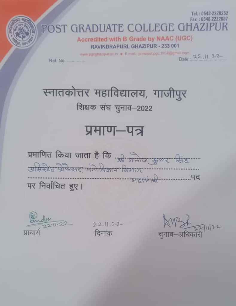 गाजीपुर। मंगलवार को पीजी कॉलेज में शिक्षक संघ के महामंत्री पद का चुनाव सम्पन्न हुआ, जिसमें महामंत्री पद हेतु दो प्रत्याशी आमने-सामने थे। डॉ मनोज कुमार सिंह मनोविज्ञान विभागाध्यक्ष को 40 वोट मिले तो वही प्रतिद्वंद्वी रहे वनस्पति विज्ञान विभाग के प्रोफेसर डॉ अमरजीत यादव को 35 वोट प्राप्त हुए। 5 वोट से डा मनोज कुमार सिंह को विजयी घोषित किया गया। चुनाव अधिकारी रहें डॉ दिनेश कुमार सिंह ने विजयी प्रत्याशी को शपथ ग्रहण कराया। नवनिवार्चित महामंत्री डॉ मनोज कुमार सिंह ने कहा कि मैं अपने आचरण एवं कार्य से शिक्षकों एवं महाविद्यालय की गरिमा, शैक्षणिक वातावरण एवं आपसी सौहार्द बनाए रखने के लिए सदैव प्रयत्नशील रहूंगा, मैं ऐसा कुछ भी नहीं करूंगा जिससे शिक्षकों एवं महाविद्यालय की गरिमा पर आँच आए। बता दें कि महाविद्यालय में कुल 75 शिक्षकों ने अपने मत का प्रयोग किया। शत् प्रतिशत मतदान हुआ, शिक्षक संघ चुनाव को देखते हुए महाविद्यालय प्रशासन ने बारह बजे के बाद छात्र-छात्राओं की छुट्टी कर दी थी, जिससे महाविद्यालय में सभी का प्रवेश वर्जित था।