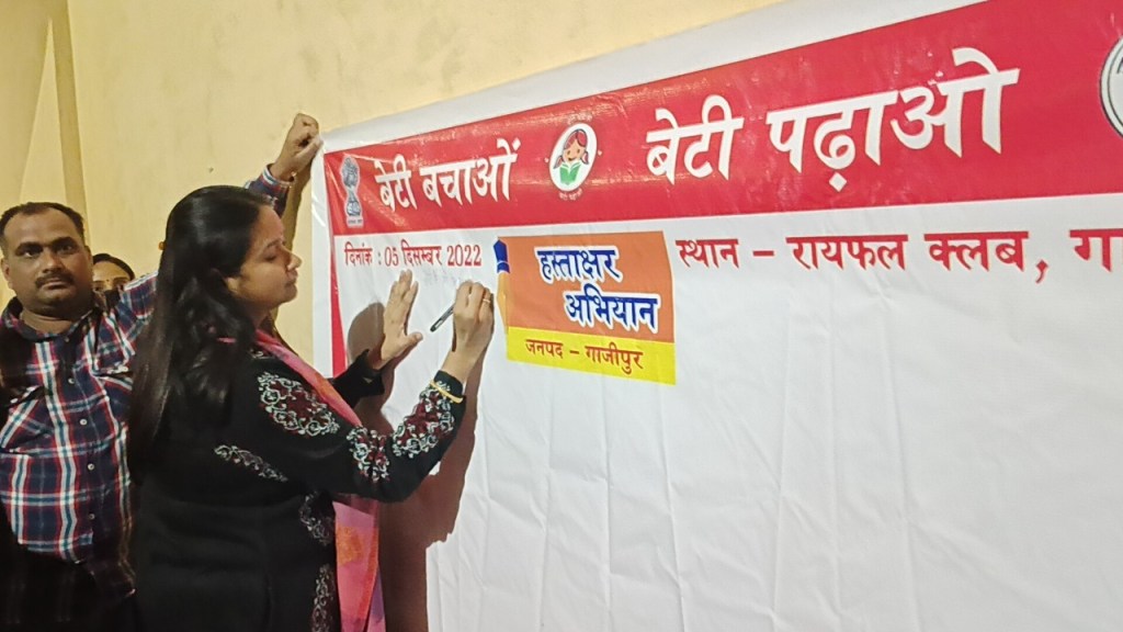 गाजीपुर। ‘‘बेटी बचाओ बेटी पढाओ‘‘ योजनान्तर्गत जिला टास्क फोर्स की बैठक जिलाधिकारी आर्यका अखौरी की अध्यक्षता एवं जिला पंचायत अध्यक्ष सपना सिंह की उपस्थित मे सोमवार को राइफल क्लब सभागार में सम्पन्न हुआ। बैठक के दौरान बेटी बचाओ बेटी पढाओ योजना पर विस्तार से समीक्षा करते हुए जिलाधिकारी ने अर्न्तविभागीय सहयोग के माध्यम से योजना का प्रचार-प्रसार का निर्देश दिया। जिलाधिकारी ने कन्या सुमंगला योजना में एल ई डी वैन, वाल पेन्टिग, एंव अन्य सहयोग के माध्यम से प्रचार-प्रसार कराते हुए राष्ट्रीय बालिका दिवस 24 जनवरी एंव अन्तर्राष्ट्रीय बालिका दिवस 11 अक्टूबर एंव चैत्र नवरात्र के दिन जनपद में नुक्क्ड़ नाटक, मैजिक शो, लीगल अवेयरनेस कैम्प, अन्य सांस्कृतिक कार्यक्रम के आयोजन का निर्देश दिया। बैठक में बेटी बचाओ बेटी पढाओ योजनान्तर्गत निदेशालय महिला कल्याण द्वारा निर्धारित आनलाइन स्प्रेडशीट पर सूचना अपडेट करने हेतु अर्न्तविभागीय सहयोग पर चर्चा की गयी जिसमें बताया गया कि आज तक की स्प्रेडसीट अपडेट है। जिलाधिकारी ने महिला कल्याण से सम्बन्धित समस्त योजनाओ को समस्त विभागो से इकठ्ठा कर ग्राम पंचायत स्तर पर कैम्प के माध्यम से महिलाओ एंव बालिकाओ को जागरूक करने का निर्देश दिया तथा कहा कि ग्राम स्तर पर लगाये गये कैम्प में पुलिस विभाग की उपस्थित अवश्य रहे, इसके लिए जहां जहां कैम्प का आयोजन हो वहा पुलिस विभाग को अवश्य सूचित किया जाये।