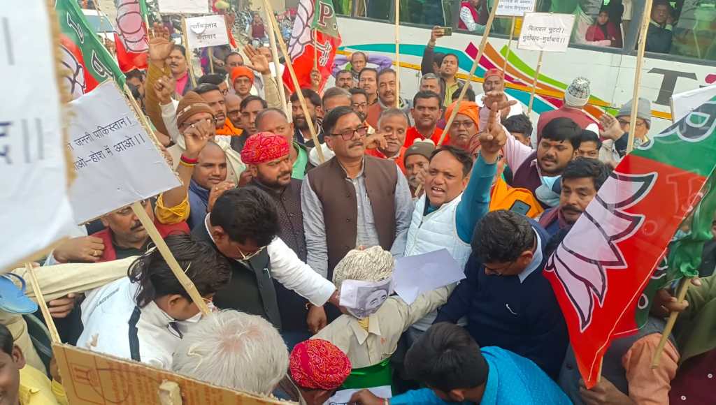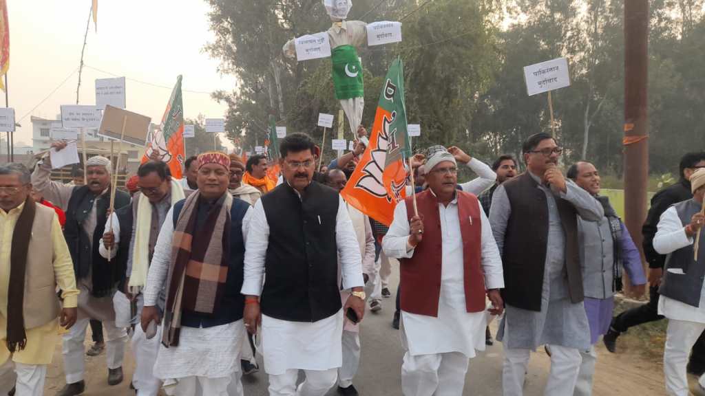गाजीपुर। पाकिस्तानी की विदेश मंत्री विलावल भुट्टो के खिलाफ राष्ट्र व्यापि अभियान के क्रम मे शनिवार को भारतीय जनता पार्टी ने जिलाध्यक्ष भानुप्रताप सिंह के नेतृत्व मे जुलूस निकाल कर पाकिस्तान और विलावल भुट्टो के खिलाफ नारे लगाते हुए भुतहियाटाड़ (प्रकाश नगर) स्थित सैनिक चौराहे पर पुतला फूंका गया। बता दें कि प्रधानमंत्री नरेन्द्र मोदी के खिलाफ वृहस्पतिवार को पाकिस्तानी विदेश मंत्री विलावल भुट्टो ने शर्मनाक और आपत्तिजनक जो टिप्पणी किया है उसको लेकर आज सायंकाल भाजपा कार्यालय छावनी लाइन से भाजपा नेताओं और कार्यकर्ताओं ने जिलाध्यक्ष भानुप्रताप सिंह, जिला प्रभारी अशोक मिश्रा, क्षेत्रीय उपाध्यक्ष सरोज कुशवाहा, कृष्ण बिहारी राय और प्रभुनाथ चौहान सहित आदि वरिष्ठ नेताओं के नेतृत्व मे जुलूस के रुप मे हाथों मे पाकिस्तान तथा पाक विदेश मंत्री विरोधी नारों से लिखी तख्तियां हाथों मे लेकर नारे लगाते हुए भुतहियाटाड़ चौराहे पहुंच कर विलावल भुटटो का पुतला जलाया। इस अवसर पर जिलाध्यक्ष ने कहा कि पाकिस्तान कि आर्थिक स्थिति भयावह हो चुकी है और पाकिस्तान सरकार का नियंत्रण समाप्त हो चुका है। ऐसे मे सस्ती लोकप्रियता के लिए विलावल भुट्टो की टिप्पणी सामने आई है जिसे भारत कत्तई बर्दाश्त नही करने वाला है। जिला प्रभारी ने कहा कि प्रधानमंत्री के खिलाफ अपमान जनक शब्दों की टिप्पणी पाकिस्तान को महंगी पडेगी। सरोज कुशवाहा ने कहा कि पाकिस्तान मे जब जब गृहयुद्ध की स्थिति बनती है तब तब वह भारत और उसके नेताओं के खिलाफ बयानबाजी करता है लेकिन भारत के प्रधानमंत्री के खिलाफ पाकिस्तानी विदेश मंत्री कि यह टिप्पणी उनके विछिप्तता और नैतिक पतन को दर्शाता है। लोक सभा संयोजक कृष्ण बिहारी राय ने कहा कि पाकिस्तान आर्थिक संकट से डवांडोल हो चुका है। और वहां के विदेश मंत्री विलावल भुट्टो पागल हो चुके है। इस अवसर पर ब्लाक प्रमुख अवधेश राय, पुर्व जिलाध्यक्ष वृजेन्द्र राय,सुनिल सिंह,वृजनन्दन सिंह,ओमप्रकाश राय,प्रो शोभनाथ यादव, दयाशंकर पांडेय,रमेश सिंह पप्पू,बालकृष्ण त्रिवेदी, अवधेश राजभर,विनोद अग्रवाल,योगेंद्र सिंह,डा मुराहु राजभर,,मनोज सिंह, संकठा प्रसाद मिश्रा,श्यामराज तिवारी, अखिलेश सिंह, सरोज मिश्रा, ओमप्रकाश राम, राजेश राजभर,अच्छे लाल गुप्ता,जिला मीडिया प्रभारी शशिकान्त शर्मा,कार्तिक गुप्ता,लालसा राजभर,,योगेश सिंह,रासबिहारी राय,राकेश राय,अनिल पांडेय,सुमित तिवारी,श्यामबली मदेशिया,किरन सिंह, विशाल चौरसिया,राजेश विश्वकर्मा,अजीत सिंह,सुनील गुप्ता, गोपाल राय,विनीत शर्मा, चतुर्भुज चौबे,संदीप सिंह,हंसराज राजभर, अनिल गुप्ता, आदि सहित सभी मोर्चा अध्यक्ष,मंडल अध्यक्ष,मंडल प्रभारी,युवा मोर्चा के वरि