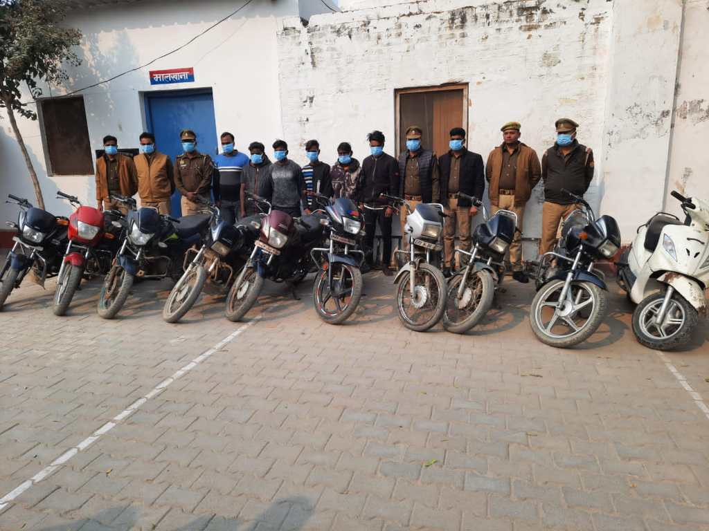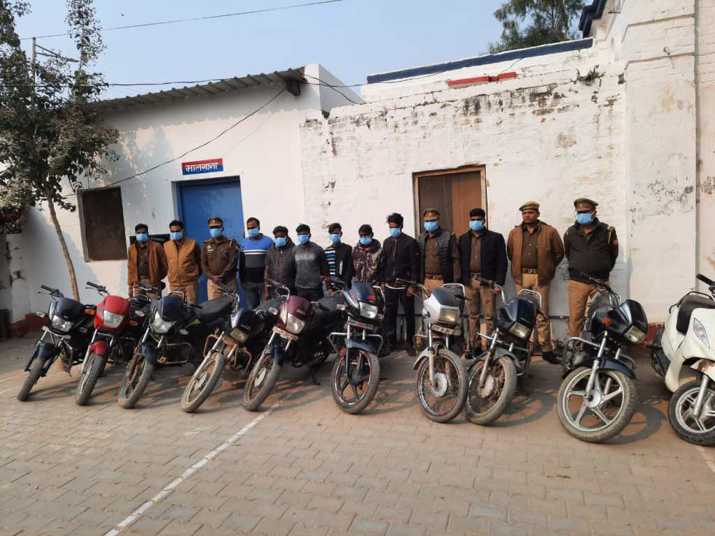 गाजीपुर। कोतवाली पुलिस और क्राइम ब्रांच टीम ने अंतर्जनपदीय वाहन चोरों के गिरोह के 5 लोगों को गिरफ्तार कर उनके पास से चोरी की 10 मोटरसाइकिल बरामद की। प्रभारी निरीक्षक तेज बहादुर सिंह, निरीक्षक अपराध सुरेन्द्र नाथ, उ0नि0 अमित कुमार पाण्डेय, उ0नि0 अभिषेक सिंह, उ0नि0 शिवाकान्त मिश्रा और सर्विलास प्रभारी उ0नि0 सुनील तिवारी ने मुखबीर की सूचना पर वाहन चोरों को नारकोटिक्स चौराहा के पास से शनिवार को गिरफ्तार कर लिया। गिरफ्तार वाहन चोरों में किशन वर्मा उर्फ विपिन पुत्र विनोद वर्मा निवासी झण्डातर अंजहिया घाट थाना कोतवाली, अभिषेक कुमार पुत्र सीताराम निवासी रजागंज थाना कोतवाली, विष्णु कश्यप पुत्र शिवशंकर कश्यप निवासी काशीराम आवास आदर्श बाजार थाना कोतवाली हालपता कलेक्टर घाट थाना कोतवाली, रामू बिन्द पुत्र स्व0 ठग्गा बिन्द निवासी सोनहरिया थाना कोतवाली और धनराज कुमार पुत्र शिवकुमार निवासी नवापुरा थाना कोतवाली शामिल है। गिरफ्तार वाहन चोरों के पास से 10 मोटर साईकिल चोरी की बरामद की गयी। चोरों को गिरफ्तार करने वाले पुलिस टीम में हेड कांस्टेबल रमेश तिवारी, हे0का0 शैलेन्द्र यादव, हे0का0 प्रेमशंकर सिंह, हे0का0 सुजीत सिंह, कांस्टेबल प्रमोद सरोज, का0 शिवशंकर यादव, का0 सदानन्द यादव, का0 रोहित और का0 लालू प्रसाद शामिल रहे।