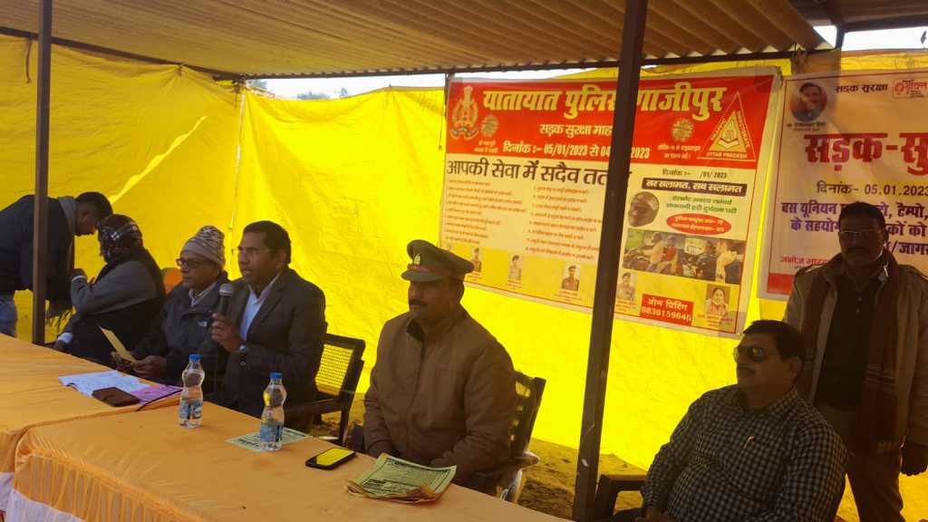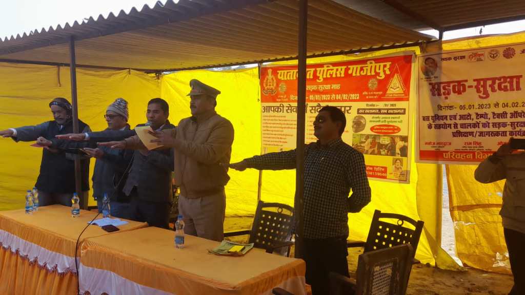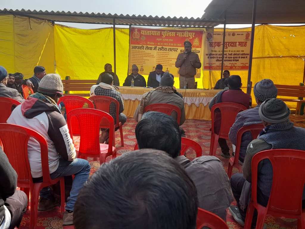 गाजीपुर। सड़क सुरक्षा माह के तहत शुक्रवार को जमानियां बस स्टैंड पर एक कार्यशाला का आयोजन किया गया। इस कार्यशाला में यातायात प्रभारी सुशील मिश्रा ने लोगो को यातायात नियमों के प्रति जागरूक किया और यातायात नियमों का पालन करने की शपथ दिलाई। उन्होंने वाहन स्वामियों को हर हाल में यातायात नियमों का पालन करने को कहा साथ ही कहा कि यातायात नियमों का पालन करके दुर्घटनाओं में कमी लाई जा सकती है। कार्यक्रम मे परिवहन विभाग के आर आई सन्तोष कुमार पटेल, रोडवेज के ए आर एम बीके पाण्डेय, हेड कांस्टेबल बाल कृष्ण मौर्य सहित यातायात पुलिस कर्मी मौजूद रहे।