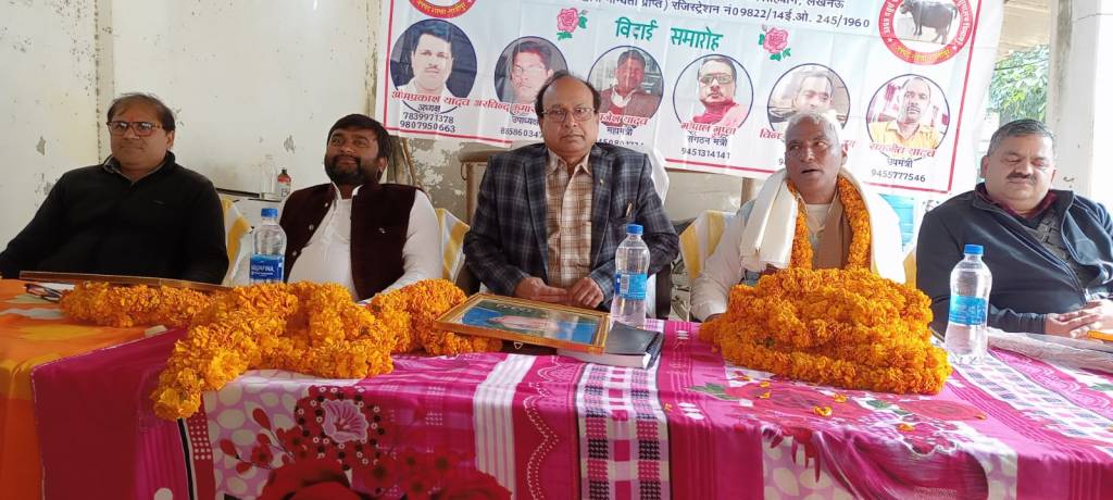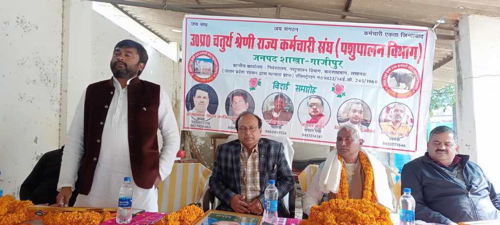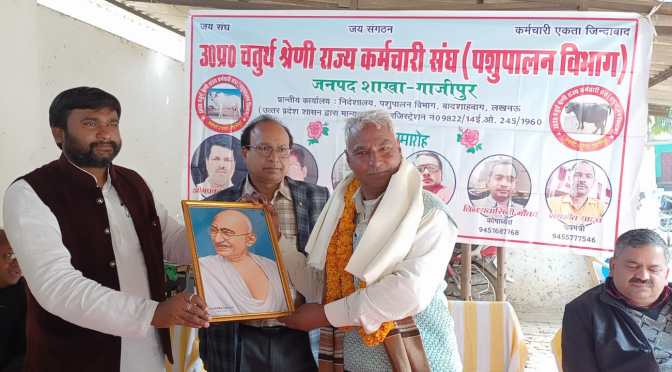 ग़ाज़ीपुर।बुधवार को उत्तर प्रदेश चतुर्थ श्रेणी राज्य कर्मचारी संघ पशुपालन विभाग द्वारा पशु चिकित्सालय सदर गाजीपुर पर सेवानिवृत्त हुए कर्मचारी का सम्मान समारोह आयोजन किया गया था।जिसमें राज्य कर्मचारी संयुक्त परिषद के जिलाध्यक्ष दुर्गेश कुमार श्रीवास्तव मुख्य अतिथि बतौर उपस्थित रहे। सेवानिवृत्त हुए कर्मचारी सोमनाथ रावत को राज्य कर्मचारी संयुक्त परिषद के जिलाध्यक्ष द्वारा रामचरितमानस पुस्तक, स्मृति चिन्ह, आदि देकर सम्मानित किया गया। मंच पर बैठे मुख्य पशु चिकित्सा अधिकारी गाजीपुर से मांग किया गया कि सेवानिवृत्त हुए कर्मचारी का संपूर्ण देयक भुगतान किया जाए, मंच पर उपस्थित मुख्य पशु चिकित्सा अधिकारी गाजीपुर द्वारा अस्वस्थ किया गया कि सेवानिवृत्त हुए कर्मचारी का समस्त देयक भुगतान एक सप्ताह के अंदर कर दिया जाएगा, उत्तर प्रदेश चतुर्थ श्रेणी कर्मचारी संघ के अध्यक्ष द्वारा सेवानिवृत हुए कर्मचारी को अंगवस्त्र भेट कर सम्मानित किया गया,और सम्मान समारोह में आए सभी पदाधिकारी,अधिकारी व सदस्यों के प्रति आभार व्यक्त किया गया ।