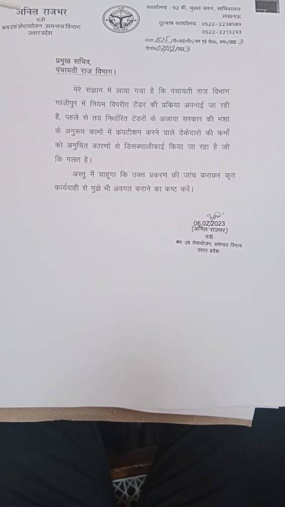 जिला पंचायत में टेंडर प्रक्रिया पर उठे सवाल, कैबिनेट मंत्री अनिल राजभर ने प्रमुख सचिव को जांच के लिए लिखा पत्र