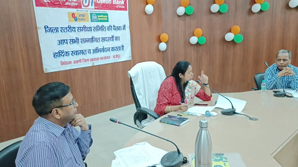 गाजीपुर। जिलाधिकारी आर्यका अखौरी की अध्यक्षता में डीसीसी और डीएलआरसी की बैठक बुधवार को रायफल क्लब सभागार में हुई। बैठक के दौरान जिलाधिकारी ने शासन द्वारा प्रायोजित विभिन्न रोजगार परक योजनाओं की समीक्षा की। जिलाधिकारी ने सभी योग्य खाताधारकों को सामाजिक सुरक्षा योजना से आच्छादित करने हेतु कैम्प मोड में कार्य करने तथा आकांक्षात्मक विकास खंडों की प्रगति पर विशेष ध्यान देने के निर्देश दिए। इसके साथ ही उन्होंने ऋण जमानुपात में वृद्धि हेतु बड़े ऋण आवेदनों के निस्तारण हेतु निर्देश दिया। समीक्षा के दौरान अग्रणी जिला प्रबंधक शिव शंकर ने बताया कि पी0एम0ई0जी0पी0, युवा स्वरोजगार योजना के तहत जनपद ने निर्धारित लक्ष्यों को प्राप्त कर लिया है। जिलाधिकारी ने उपस्थित सभी बैंक अधिकारियों को फिशरीज के0सी0सी0, KCC एवं पशुपालन को प्रमुखता से स्वीकृत करने के निर्देश दिए। उन्होंने स्वनिधि योजना में और अधिक आवेदन करने हेतु डूडा को निर्देशित किया तथा बैंकों में लंबित आवेदनों के यथाशीघ्र निस्तारण हेतु निर्देशित किया। बैठक में मुख्य विकास अधिकारी श्री श्रीप्रकाश गुप्ता, डीसी छत्स्ड, लीड बैंक मैनेजर शिव शंकर, उप निदेशक कृषि अतिंद्र सिंह, जिला कृषि अधिकारी मृत्युंजय सिंह, LDO आरबीआई, डीडीएम नाबार्ड तथा सभी बैंकर्स उपस्थित रहे।