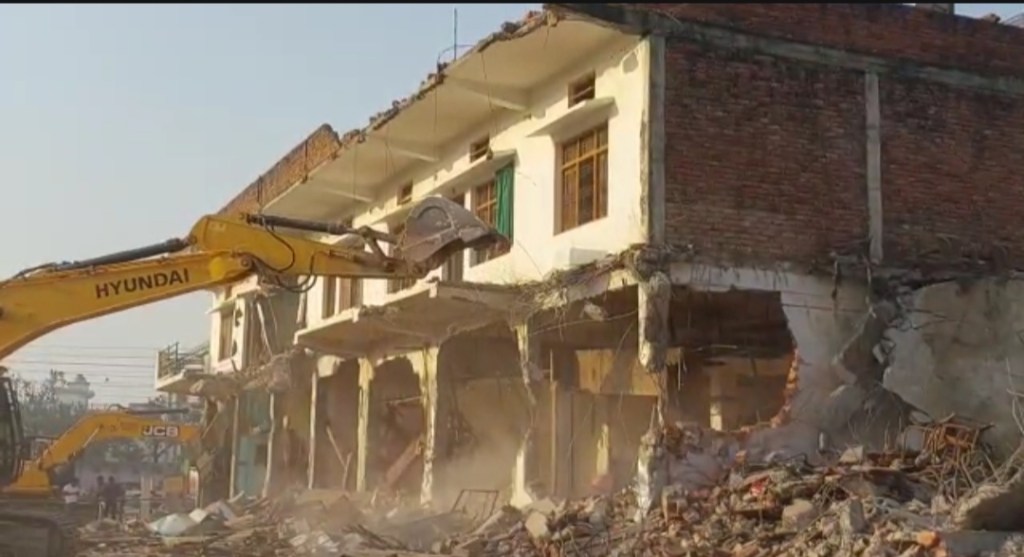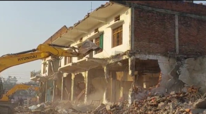 गाजीपुर। योगी सरकार के एंटी माफिया अभियान के तहत जिले में बड़ा एक्शन लिया गया है। फुल्लनपुर स्थित रेलवे क्रासिंग के पास रविवार की सुबह मुख्तार अंसारी के करीबी रहे स्व.कमलेश सिंह की अवैध दो मंजिला बिल्डिंग पर प्रशासन का बुलडोजर चला। प्रशासन ने बगैर नक्शा पास कराये बनी इस बिल्डिंग को ध्वस्त करा दिया है। बताया जा रहा है कि वर्षो पूर्व इस बिल्डिंग का निर्माण हुआ था। जिसे बगैर नक्शा पास कराये ही बनाया गया था। कमलेश सिंह के इस अवैध निर्माण को लेकर प्रशासन के द्वारा नोटिस जारी किया गया था। 4 मई 2022 को डीएम के आदेश पर आरओबी एक्ट के तहत कार्रवाई की गयी है। डीएम के निर्देश पर इस अवैध बिल्डिंग पर ध्वस्तीकरण की कार्रवाई की गई है। इस मकान में कई दुकानें बनी हुई थी। इसमें वाणिज्य कर कार्यालय और यूनियन बैंक की शाखा भी थी। जिसे प्रशासन की नोटिस के बाद शनिवार को खाली कर दिया गया था। रविवार की सुबह ही भारी पुलिस फोर्स के साथ चार पोकलेन (बुलडोजर) भी वहां पहुंच गयी थी। अवैध निर्माण पर बुलडोजर चलने लगा। इस कार्रवाई के दौरान दोनों तरफ से रास्ता को बंद कर दिया था। जिससे प्रशासन को कार्रवाई करने में कोई परेशानी न हो। कार्रवाई के दौरान एडीएम, एसपी सिटी गोपीनाथ सोनी, सदर एसडीएम प्रतिभा मिश्रा, सीओ सदर गौरव कुमार तथा कई थानों की फोर्स रही।