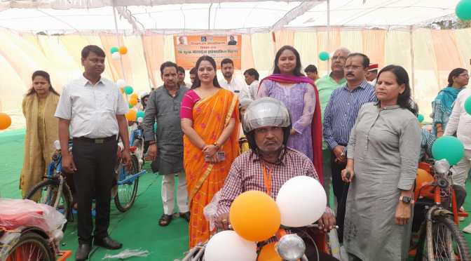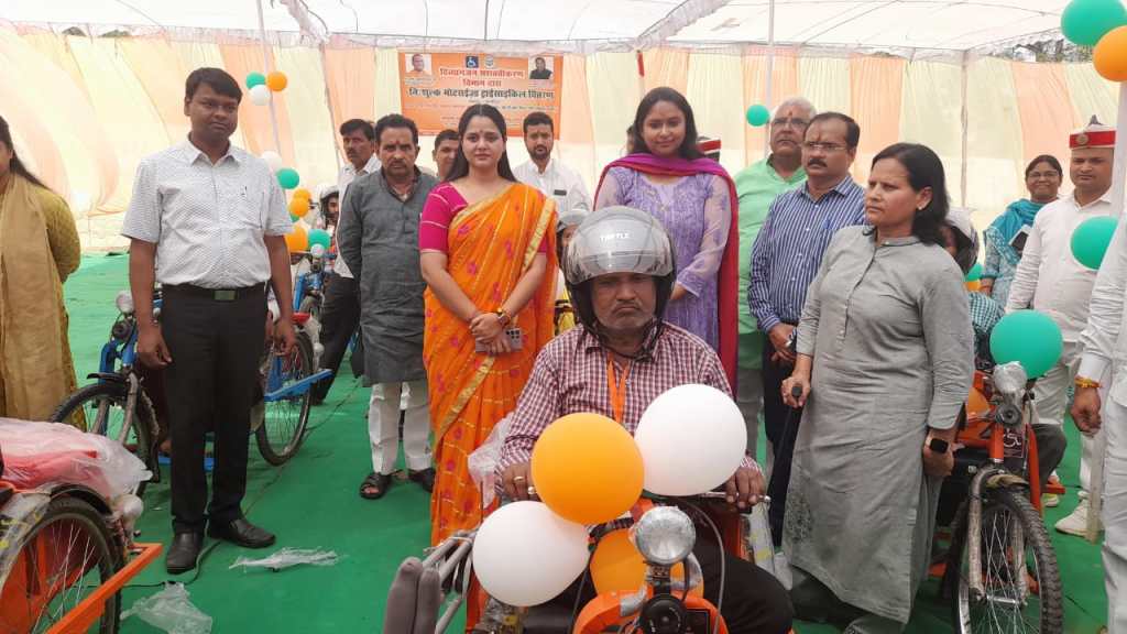 गाजीपुर। दिव्यांगजन सशक्तिकरण विभाग द्वारा निःशुल्क मोटराईज्ड ट्राई साइकिल वितरण कार्यक्रम का आयोजन आर टी आई मैदान नवीन स्टेडियम में सोमवार को मुख्य अतिथि अध्यक्ष जिला पंचायत सपना सिंह एवं जिलाधिकारी आर्यका अखौरी द्वारा किया गया। इस कार्यक्रम में उन्होने 40 दिव्यांगजनो को मोटराईज्डट्राई साइकिल वितरण कर उन्हे शुभकामना दी। इस अवसर पर मुख्य विकास अधिकारी संतोष कुमार वैश्य, उप जिलाधिकारी सदर प्रतिभा मिश्रा, जिला विकास अधिकारी, परियोजना निदेशक राजेश यादव, अपर मुख्य अधिकारी सुजीत कुमार मिश्रा, जिला समाज कल्याण अधिकारी राम नगीना यादव, जिला दिव्यांग अधिकारी नरेन्द्र विश्वकर्मा, जिला सूचना एंव विज्ञान अधिकारी अखिलेश जायसवाल, सविता सिंह समाज सेवी एवं अन्य जनपद स्तरीय अधिकारी एवं जनप्रतिनिधि उपस्थित थे।