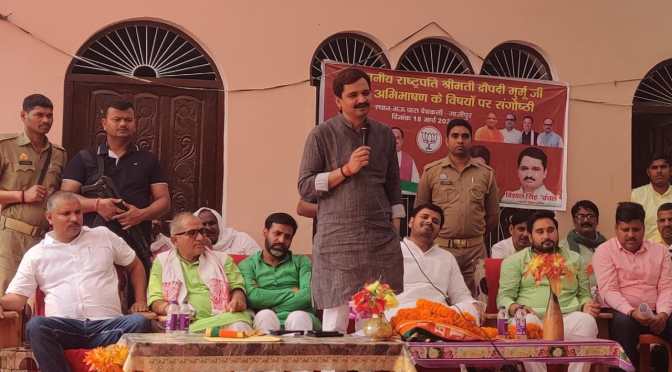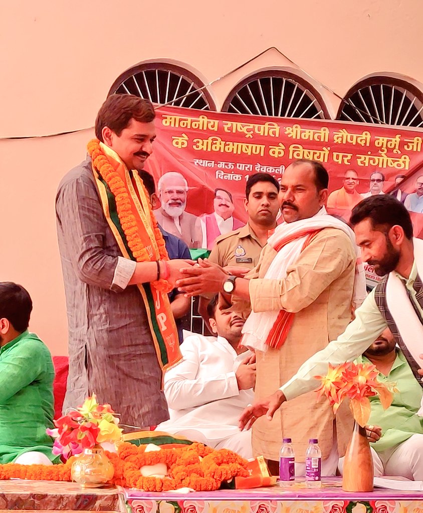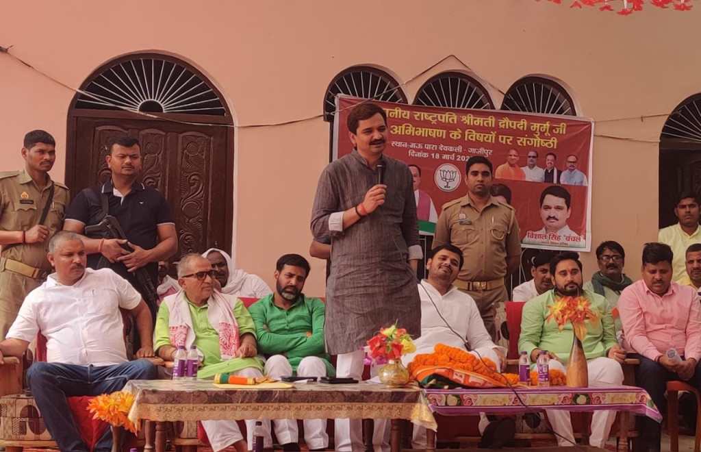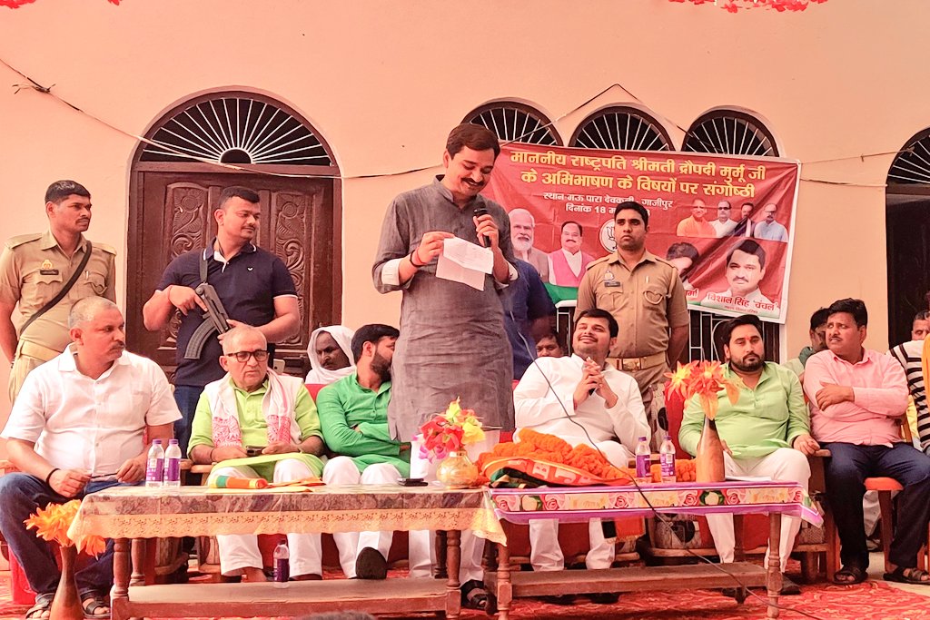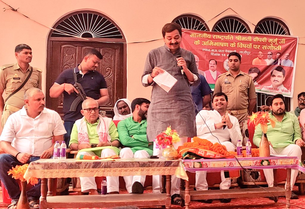 गाजीपुर। देवकली ब्लाक के माऊपारा ग्राम मे राष्ट्रपति द्रौपदी मुर्मू के अभिभाषण विषय पर संगोष्ठी देवकली मंडल शक्ति केन्द्र के तत्वाधान मे शनिवार को आयोजित किया गया। संगोष्ठी को संबोधित करते हुए मुख्य अतिथि विधान परिषद सदस्य विशाल सिंह चंचल ने कहा की केन्द्र व प्रदेश मे सत्तारुण भाजपा के शासनकाल मे गाजीपुर जनपद का बहुमुखी विकास हो रहा है। जिसमे जनपद मे मेडिकल कालेज, फोरलेन सहित गांवो मे सङकों का निर्माण, रेलवे स्टेशन सहित अन्य विकास कार्य जारी है, साथ ही विगत नौ वर्षो मे सरकार द्वारा संचालित जनकल्याणकारी योजनाओ और उपलब्धियों के बारे में भी अवगत कराया। एमएलसी ने विरोधियो पर तंज कसते हुए कहा की विधायक व सासंद ऐसा चुने की जो आप लोगो के सुख – दुख, दर्द मे शामिल हो। भारतीय जनता पार्टी एक ऎसी पार्टी है जिसमें बिना भेद भाव बरते सभी जाति, धर्म, समप्रदाय का विकास कर रही है। जब तक समाज के दबे, कुचले वर्गो का विकास नही होगा तब तक हमारा राष्ट्र समृद्धसाली नही हो सकता है। संगोष्ठी कार्यक्रम में एमएलसी प्रतिनिधि डा. प्रदीप पाठक, लोकसभा संयोजक आईटी अनूप जायसवाल, नरेन्द्र कुमार मौर्या, दीलीप गुप्ता, कमलेश पाण्डेय, अवधेश सिंह, प्रवीण त्रिपाठी, नौसाद अहमद, रामलोचन राम, कृपाशंकऱ कुशवाहा, सनाउल्लाह शन्ने, लड्डन अहमद, राजेश गुप्ता आदि लोग प्रमुख रुप से मॊजूद थे। अध्यक्षता ब्लाक प्रमुख प्रतिनिधि उपेन्द्र लाल यादव व संचालन आँशु दूबे ने किया। अंत मे कार्यक्रम के आयोजक शक्ति केन्द्र प्रमुख पवन वर्मा ने आये हुए लोगो के प्रति आभार व्यक्त किया।