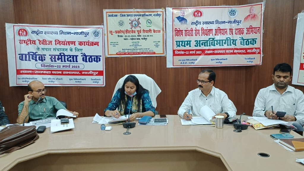 गाजीपुर। विशेष संचारी रोग नियंत्रण, दस्तक अभियान, संचारी रोगों, दिमागी बुखार पर प्रभावी नियंत्रण एवं कार्यवाही हेतु बुधवार को जिलाधिकारी आर्याका अखौरी की अध्यक्षता में जनपद स्तरीय अंन्तर्विभागीय समन्वय बैठक रायफल क्लब सभागार में हुई। बैठक मे जिलाधिकारी ने प्राप्त विभागीय कार्ययोजनाओ की समीक्षा करते हुए समस्त विभागो को कार्ययोजना के तहत ही कार्यवाही का निर्देश दिया। उन्होने कहा कि संचारी रोग, दिमागी बुखार पर प्रभावी नियंत्रण एवं इसके त्वरित एवं सही उपचार सरकार की सर्वाेच्च प्राथमिकता है। संचारी रोग नियंत्रण अभियान के प्रथम चरण जो 1 अप्रैल से 30 अप्रैल 2023 तक दस्तक अभियान 17 से 30 अप्रैल के मध्य प्रस्तावित है। उन्होने कहा कि जनपद में तहसील, ब्लॉक, ग्राम स्तर पर व्यापक जन जागरूकता अभियान चलाते हुए आमजन को मच्छर जनित एवं संचारी रोगों से बचने के लिए क्या करें और क्या न करें के बारे में जागरूक करने का निर्देश दिया। उन्होने निर्देश दिया कि बच्चों को स्कूलों में लार्वा पनपने के स्रोतों की न केवल जानकारी दी जाए बल्कि उनके मध्य प्रतियोगिता भी कराई जाए। सभी मलेरिया निरीक्षकों को फील्ड में एक्टिवेट किया जाए तथा हाई रिस्क गांव में युद्ध स्तर पर स्वच्छता अभियान चलाया जाय। उन्होने निर्देश दिया कि अभियान में आशा-आंगनबाड़ी साथ मे अनिवार्य रूप से भ्रमण करे। शहरी-ग्रामीण क्षेत्र में फागिग व एंटीलार्वा एक्टिविटी बढाया जायें। हैंडपंप एंव अन्य जल जमाव वाले स्थलो को चिन्हित करते हुए यह सुनिश्तिच करे कि कही भी आसपास जलजमाव ना हो, वही हैंडपंप से डेढ़ मीटर दूरी तक नाली बनवाए। सुपरक्लोरिनेशन के साथ पेयजल की सप्लाई सुनिश्चित करें।