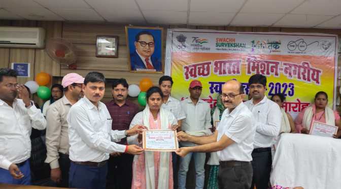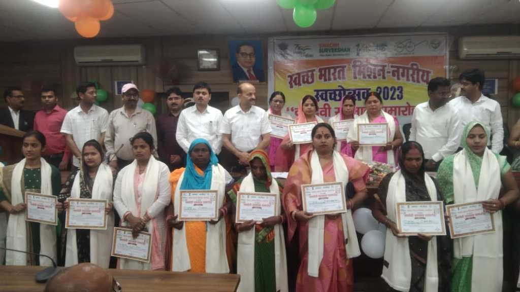 गाजीपुर। नगर पालिका परिषद द्वारा स्वच्छ भारत मिशन के अन्तर्गत ‘‘नवदेवी सम्मान’’ समारोह जिला पंचायत सभागार में मंगलवार को आयोजित किया गया, जिसमें स्वच्छता में महिलाओं की भागीदारी के लिए 27 महिलाओं को 9 श्रेणी में स्वयं सहायता समूह, वेस्ट टू वेल्थ, ठोस अपशिष्ट प्रबन्धन में उद्यमी, सफाई मित्र, मास्टर ट्रेनर, नवाचार, सामुदायिक खाद, निकाय की स्थिति में परिवर्तन, सामुदायिक जागरूकता आदि में योगदान देने वाली महिलाओं को अरूण कुमार सिंह अपर जिलाधिकारी, प्रशासक, प्रभारी स्थानीय निकाय गाजीपुर एवं अधिशासी अधिकारी द्वारा सम्मानित किया गया। नगर पालिका परिषद के अधिशासी अधिकारी लालचन्द्र सरोज ने बताया कि शासन द्वारा 7 मार्च से 30 मार्च 2023 तक ‘‘स्वच्छोत्सव-2023’’ अभियान चलाया जा रहा है जिसमें निकाय स्तर पर स्वच्छता के क्षेत्र में उत्कृष्ट कार्य करने वाली महिलाओं के प्रयास को पहचान कर सम्मानित किया गया है। जिसमें नीलम सिंह, श्रुति यादव, प्रियांजली चौधरी, शीला देवी, चिंता देवी, अमृता सिंह, प्रियंका रावत, संजु देवी, सरिता यादव, उषा साहनी, गिरजा प्रजापति, अनीता देवी, रीमा सिंह, सीमा यादव, गीता देवी, निर्मला देवी, विमला देवी, सरवरी बेगम, जैबुन निशा, गुड़िया देवी, मनीषा रावत, माया देवी, संगीता देवी, रेशमा बानो, रेखा रावत, इन्दू देवी, उषा राजभर शामिल हैं। उक्त कार्यक्रम में अधिशासी अधिकारी मोहम्मदाबाद वीरेन्द्र राव, जमानिया अखिलेश तिवारी, सैदपुर व सादात आशुतोष त्रिपाठी, दिलदारनगर मनोज कुमार पाण्डेय, बहादुरगंज सुरेन्द्र प्रताप सिंह आदि अधिकारी उपस्थित थे। कार्यक्रम का संचालन पालिका अधिवक्ता जयसूर्य भट्ट द्वारा किया गया।