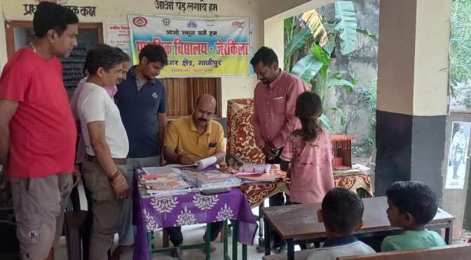 गाजीपुर। प्राथमिक विद्यालय जेर किला के प्रांगण में शनिवार को शासन की महत्वपूर्ण योजना स्कूल चलो अभियान के तहत जिला प्रचारक प्रेम सागर, नगर प्रचारक जमानिया जिलासह व्यवस्थापक हृदय प्रकाश, कमलेश वर्मा, शंकर पांडे, राजेश वर्मा एवं अन्य लोगों ने विद्यालय के बच्चों को नि शुल्क पाठ्य पुस्तक, कॉपियां व पेन वितरित की गई एवं दो बच्चों का सांकेतिक नामांकन विद्यालय में किया। यह उपहार पाकर बच्चों के चेहरे पर मुस्कान आ गई। इस अवसर पर प्रधानाध्यापक पीयूष कुमार श्रीवास्तव ने सभी का आभार व्यक्त किया।