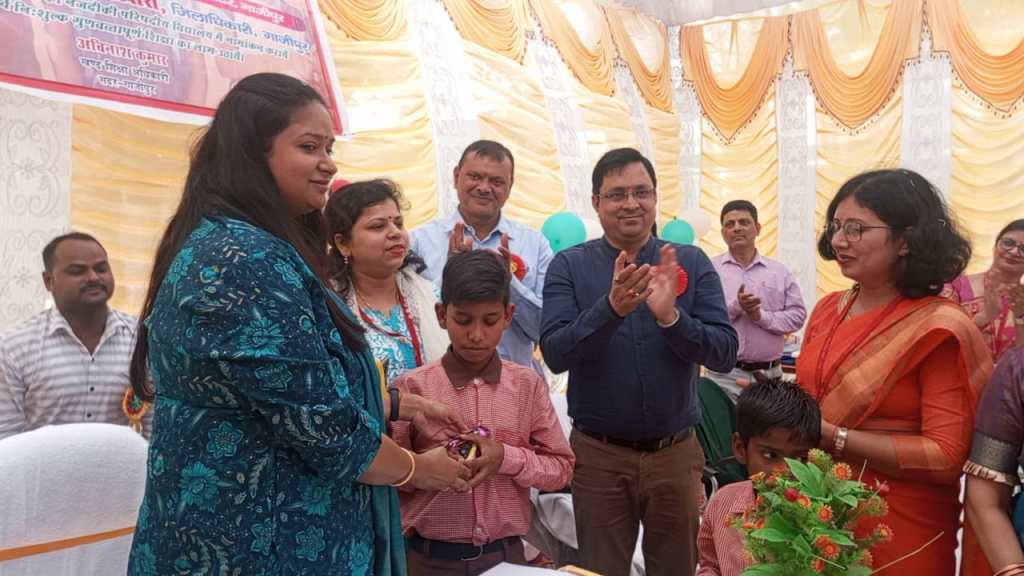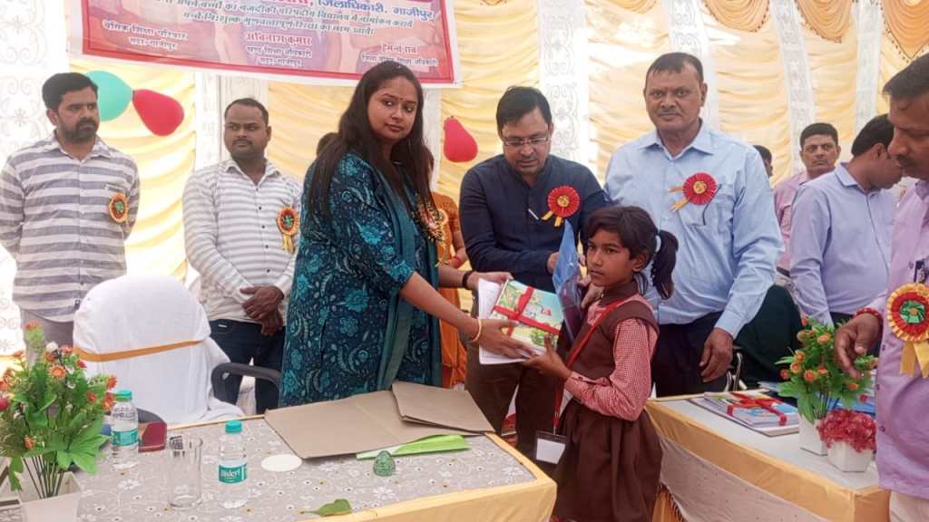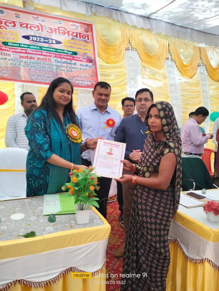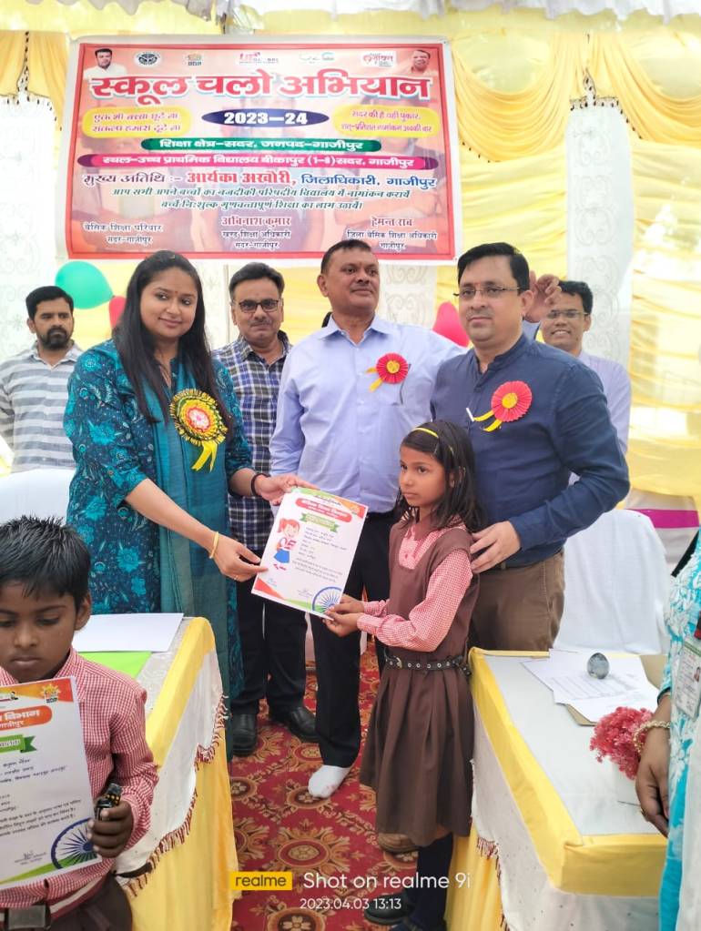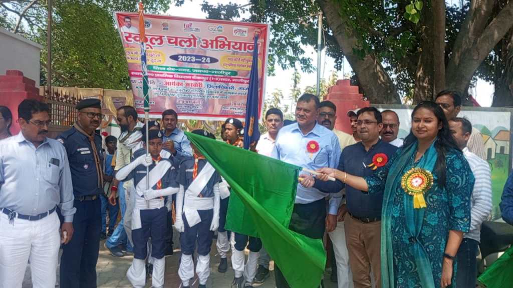 गाजीपुर। उच्च प्राथमिक विद्यालय बीकापुर के प्रांगण में स्कूल चलो अभियान के नवीन शैक्षिक सत्र का शुभारम्भ सोमवार को जिलाधिकारी आर्यका अखौरी की अध्यक्षता में हरी झंडी दिखाकर किया गया। कार्यक्रम का शुभारम्भ जिलाधिकारी द्वारा माँ सरस्वती की प्रतिमा पर द्वीप प्रज्वलित कर किया गया। तत्पश्चात उच्च प्राथमिक विद्यालय बीकापुर की छात्राओं द्वारा स्वागत गीत एवं सरस्वती वंदना प्रस्तुत किया गया। इस दौरान जिलाधिकारी द्वारा 10 बच्चों का नामांकन प्रवेश फॉर्म भरा गया। तत्पश्चात नामांकित छात्रों को शासन द्वारा प्रदत्त निःशुल्क पाठ्य पुस्तकें एवं चॉकलेट भी वितरित किया गया।