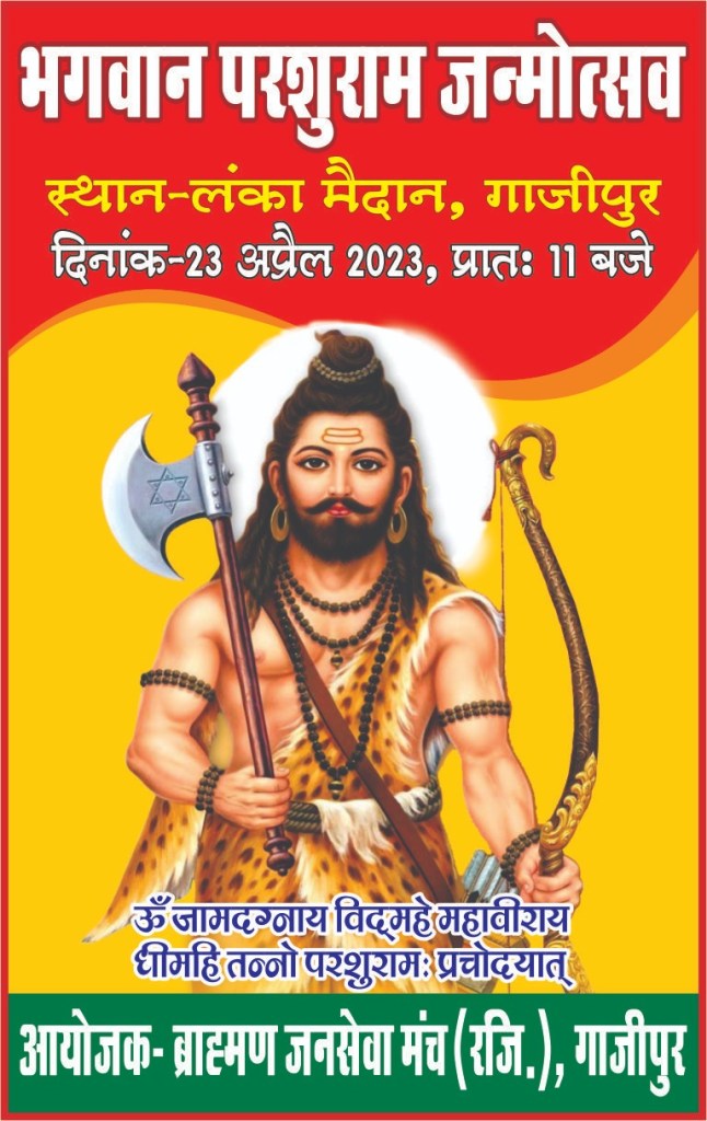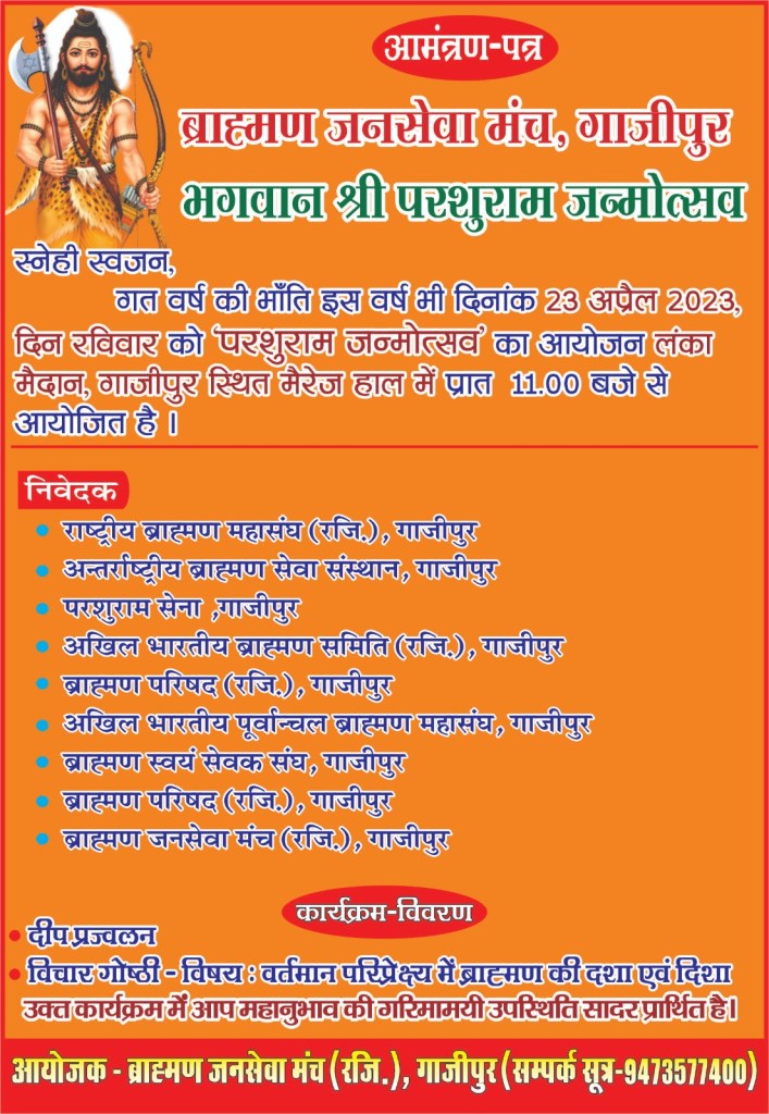 गाजीपुर। ब्राह्मण जन सेवा मंच की कोर कमेटी की बैठक मंगलवार को सरकारी कॉलोनी आमघाट स्थित कैंप कार्यालय पर हुई। इस बैठक में 23 अप्रैल को लंका मैदान में होने वाली परशुराम जयंती समारोह की तैयारी की समीक्षा की गई। इस कार्यक्रम में सर्वोच्च न्यायालय के वरिष्ठ अधिवक्ता पीएलआई मैन के नाम से विख्यात अश्वनी उपाध्याय, बिहार प्रांत के विधायक मुन्ना तिवारी, तारकेश्वर मिश्रा राही साहित्यकार/गीतकार, डा उधा प्रसाद पांडे पूर्व कुलपति मणिपुर केंद्रीय विश्वविद्यालय, डॉ ज्ञानेश्वर चौबे प्रोफ़ेसर जंतु विज्ञान काशी हिंदू विद्यालय के साथ ही सदस्य बार काउंसिल ऑफ उत्तर प्रदेश के अरुण कुमार त्रिपाठी सहित अन्य बुद्धिजीवी लोग परशुराम जयंती कार्यक्रम में भाग लेंगे। संस्था के संस्थापक/संयोजक प्रदीप कुमार चतुर्वेदी ने कहा कि सभी जिले के संरक्षक और सह संरक्षक अपने अपने क्षेत्र से अधिक से अधिक ब्राह्मण बंधुओं को प्रेरित कर परशुराम जयंती में उपस्थित करा कर बुद्धिजीवियों के विचारों को सुनें एवं उनसे प्रेरणा प्राप्त करें।