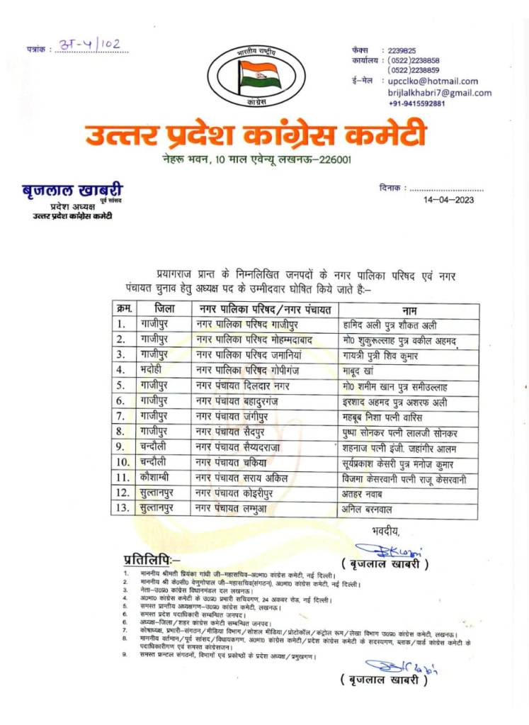 Ghazipur, Poltics कांग्रेस ने लगाई तीन नगर पालिका और पांच नगर पंचायत के प्रत्याशियों पर मुहर April 15, 2023 tiwarishivpratap Leave a comment गाजीपुर। कांग्रेस पार्टी ने शनिवार को तीन नगर पालिका और पांच नगर पंचायत के प्रत्याशियों की घोषणा कर दी है। Share this: Click to share on X (Opens in new window) X Click to share on Facebook (Opens in new window) Facebook Like Loading... Related