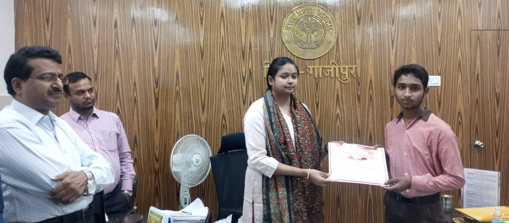 गाजीपुर। राष्ट्रीय आय एवं योग्यता आधारित छात्रवृत्ति योजना परीक्षा 2022-23 में जनपद गाजीपुर को आवंटित 184 सीटों के सापेक्ष शत-प्रतिशत परिषदीय बच्चों ने सफलता प्राप्त कर जनपद के साथ-साथ बेसिक शिक्षा विभाग का नाम रोशन किया है। जिलाधिकारी आर्यका अखौरी ने हर्ष व्यक्त करते हुए उक्त परीक्षा में सफल हुए समस्त परिषदीय बच्चों को कलेक्टेट कार्यालय में मंगलवार को सम्मानित किया। उक्त परीक्षा में शाइना खान उ०प्रा०वि० शक्करपुर मु०बाद ने प्रथम स्थान प्राप्त कर जनपद का नाम रोशन किया। विकास खंडवार प्रदर्शन में शिक्षा क्षेत्र सैदपुर, मु०बाद एवं देवकली ने क्रमशः प्रथम, द्वितीय एवं तृतीय स्थान प्राप्त किया है।
