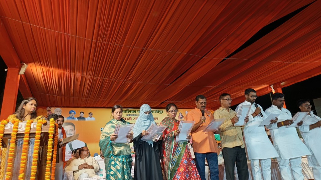 इस दौरान अधिशाषी अधिकारी मनोज कुमार पांडेय,पूर्व विधायक सुनीता सिंह,बीजेपी जिला महामंत्री ओमप्रकाश राय, डॉ काजिम,संजीत कुशवाहा, रामेश्वर, प्रधान सतेंद्र यादव,अमजद खा, राहुल जायसवाल इत्यादि लोग रहे। इस दौरान संदीप जायसवाल, बंटी सिंह, बॉबी सिंह सहित सहित सैकड़ों लोग मौजूद रहे। राम लीला मैदान तहसील जमानियां में उपजिलाधिकारी जमानिया एवं नगर पालिका परिषद मुहम्मदाबाद के अध्यक्ष/सदस्यों का शपथ ग्रहण कार्यक्रम कार्यालय जलकल में उपजिलाधिकारी मुहम्मदाबाद की अध्यक्षता में सम्पन्न हुआ। नगर पंचायत सादात में शपथ ग्रहण उपजिलाधिकारी जखनियां, नगर पंचायत सैदपुर मे उपजिलाधिकारी सैदपुर, नगर पंचायत जंगीपुर का मण्डी समिति जंगीपुर में उपजिलाधिकारी सदर एवं नगर पंचायत बहादुरगंज के नव निर्वाचित अध्यक्ष/सदस्यों का शपथ ग्रहण कार्यक्रम उपजिलाधिकारी कासिमाबाद की अध्यक्षता में पूर्व मे निर्धारित स्थलो पर सम्पन्न हुआ। जहां नव निर्वाचित अध्यक्ष/सदस्यगणो को पद एवं गोपनीयता की शपथ दिलाई गयी।