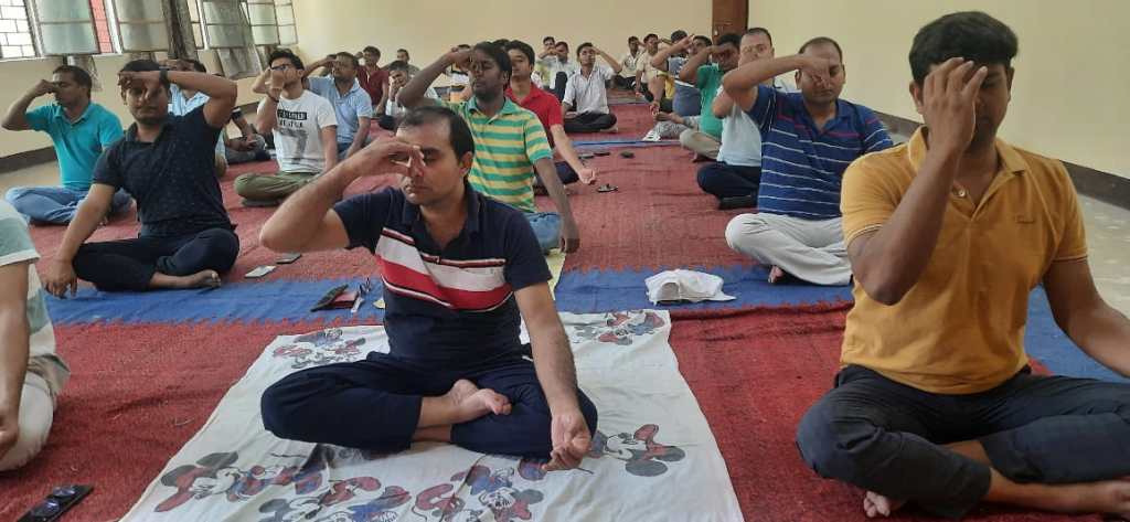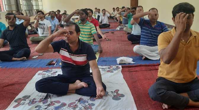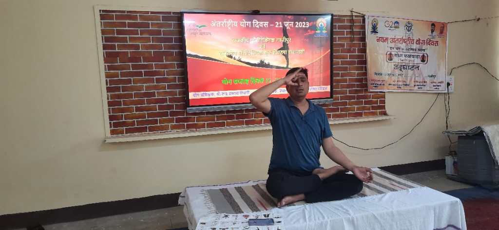 गाजीपुर। 21 जून को 9वे अन्तर्राष्ट्रीय योग दिवस के उपलक्ष्य में राजकीय पालीटेक्निक के प्रांगण में 15 से 21 जून तक योग सप्ताह का आयोजन प्रचलन में है। इस कार्यक्रम के अन्तर्गत शुक्रवार को आयोजित योग शिविर में राजकीय पालीटेक्निक गाजीपुर एवं राजकीय पालीटेक्निक कुरू पिण्डरा वाराणसी के अधिकारीयों, कर्मचारीयो और छात्र छात्राओं ने योग प्रशिक्षक रूद्र प्रकाश तिवारी के मार्गदर्शन में योगाभ्यास किया। उक्त कार्यक्रम में तिवारी ने उपस्थित छात्र/छात्राओं को सामान्य योग अभ्यासक्रम के अन्तर्गत आने वाले विभिन्न आसनों एवं प्रणाचामो को कराया तथा उनसे होने वाले लाभों के बारे में बताया। योग-सत्र का समापन दैनिक योग के संकल्प एवं शांति पाठ के साथ हुआ। इस अवसर पर कार्यवाहक प्रधानाचार्य परमान्नद सिंह यादव ने धन्यवाद ज्ञापन किया।