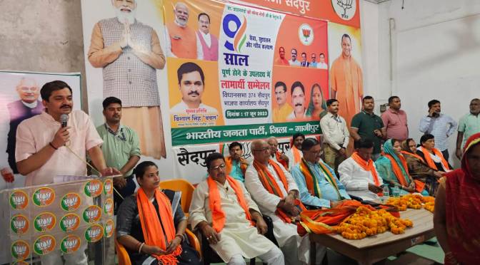 गाजीपुर। विधानसभा सैदपुर स्थित पूर्व विधायक सुभाष पासी के कार्यालय पर भारतीय जनता पार्टी ने नौ साल बेमिसाल लाभार्थी सम्मेलन का आयोजन शनिवार को जिलाध्यक्ष भानु प्रताप सिंह कि अध्यक्षता में किया गया। सम्मेलन में मुख्य अतिथि एमएलसी विशाल सिंह चंचल ने केंद्र सरकार की योजनाओं का बखान करते हुए कहा कि प्रधानमंत्री नरेन्द्र मोदी की 2014 मे ज़ब जनता के आशीर्वाद से पूर्ण बहुमत की सरकार बनी। सरकार बनते ही लालकिले से भरोसा जताया की ये गरीबो का घर बनाने और उनके कल्याण के लिए सरकार बनी है। उन्होंने कहा कि प्रधानमंत्री की माँ दुसरो के घरों मे बर्तन माजने का कार्य करती थी। उन्होंने अपनी माँ के तकलीफो को देखा है। गरीब का बेटा ही गरीबों और उनकी मजबूरी को समझ सकता है। सरकार बनते ही प्रधानमंत्री ने सड़क, बिजली, शौचालय पर तत्काल कार्य करना शुरू किया। जितना 70 सालों में कार्य नहीं हुआ उससे ज्यादा प्रधानमंत्री जी ने 9 साल में अद्भुत कार्य करके दिखाया है। जन धन योजना के तहत गरीब परिवारो का जीरो बैलेंस से खाता खुलवाने का कार्य प्रधानमंत्री ने किया है। उन्होंने कहा की अब बिना बिचौलियों के गरीबों के खाते में सरकार की जनकल्याणकारी योजनाओं का लाभ सीधे उनके खाते में पूरा-पूरा पहुंचता है।