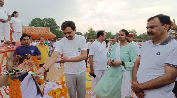 जिला प्रशासन द्वारा पुलिस लाइन प्रांगण में आयोजित कार्यक्रम का शुभारंभ मुख्य अतिथि विधान परिषद सदस्य विशाल सिंह चंचल, अध्यक्ष नगर पालिका परिषद सरिता अग्रवाल, जिलाधिकारी आर्यका अखौरी, पुलिस अधीक्षक ओमवीर सिंह एवं मुख्य विकास अधिकारी संतोष कुमार वैश्य ने दीप प्रज्ज्वलित एंव धन्वतरि के चित्र पर माल्यापर्ण कर किया। मौके पर अपर जिलाधिकारी वि0रा0 अरूण कुमार सिंह,, समस्त जनपद स्तरीय विभागो के अधिकारी एवं कर्मचारी, के अलावा कुल लगभग चार हजार लोगो ने अंन्तर्राष्ट्रीय योग दिवस में प्रतिभाग किया।