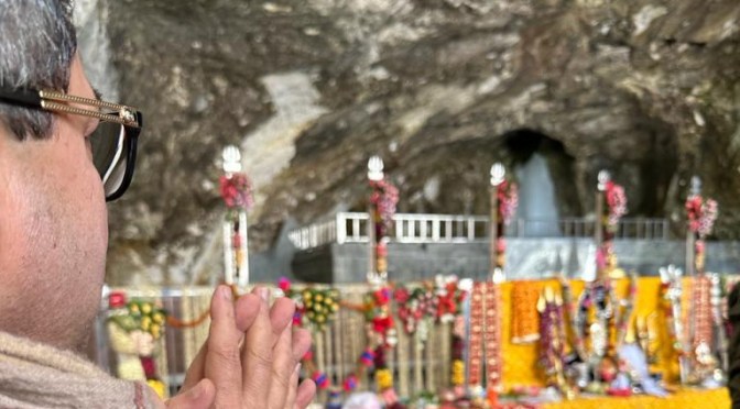 अमरनाथ गुफा पहुंचकर बाबा बर्फानी के दर्शन किए, पुजारियों ने करवाई पूजा