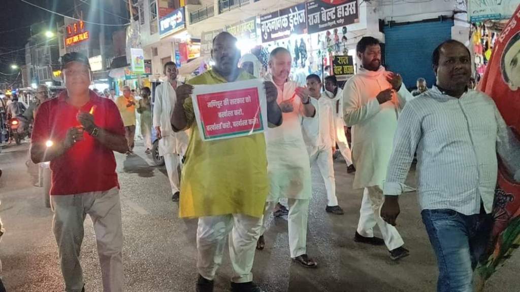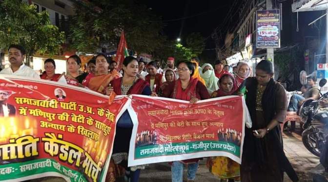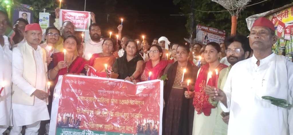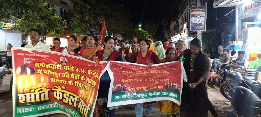गाजीपुर। शनिवार को पार्टी के राष्ट्रीय अध्यक्ष अखिलेश यादव के निर्देश पर समाजवादी पार्टी की महिला सभा के तत्वावधान में जिलाध्यक्ष विभा पाल के नेतृत्व में मणिपुर में महिलाओं के साथ हुई दरिंदगी और निर्वस्त्र कर घुमाये जाने के विरोध में महुवाबाग से गांधी पार्क आमघाट तक कैंडल मार्च निकाल कर विरोध दर्ज कराया गया। इस अवसर पर जिलाध्यक्ष गोपाल यादव ने आक्रोश व्यक्त करते हुए तथा इस घटना की तीखी निंदा करते हुए इसे मानवता को शर्मशार कर देने वाला बताया।