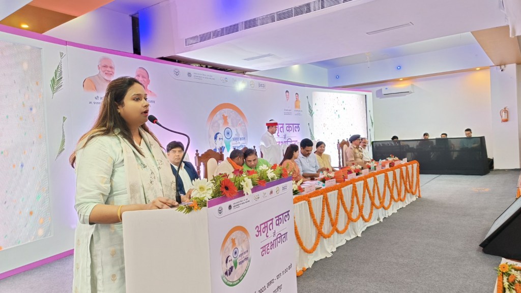 गाजीपुर। अमृत काल में सहभागिता कार्यक्रम का आयोजन जलसा गार्डेन बबेडी में बुधवार को सम्पन्न हुआ। जिसमें मुख्य अतिथि राज्य मंत्री (स्व0प्रभार) समाज कल्याण विभाग उत्तर प्रदेश शासन असीम अरूण ने दीप प्रज्ज्वलित कर कार्यक्रम का शुभारम्भ किया। अमृत काल मे सहभागिता कार्यक्रम के अवसर पर लखनऊ मुख्यालय से आये समाज कल्याण विभाग के अधिकारियों ने विभागीय योजनाओ से उपस्थित नवयुवको, छात्र-छात्राओं, प्रबुद्ध नागरिको, उद्यमियो, आगन्तुको को विस्तारपूर्वक जानकारी दी। जे0राम महाप्रबन्धक उ0प्र0 अनुसूचित जाति वित्त एवं विकास निगम लि0लखनऊ ने ‘‘आइये बिजनेस करें‘‘। विपिन कुमार पाण्डेय जिला समाज कल्याण अधिकारी अनुगम ने ‘‘हाथ मे हुनर‘‘ और पवन कुमार यादव जिला समाज कल्याण अधिकारी मुख्यालय ने ‘‘सफलता की कुंजी‘‘ पर प्रस्तुतिकरण करते हुए विस्तार पूर्वक जानकारी दी। कार्यक्रम के दौरान मंत्री ने उपस्थित छात्र-छात्राओ एवं उद्यमियों को शुभकामना देते हुए कहा कि आज सारा सम्बोधन युवाओ के लिए है, जितना हम उर्जा से काम करते है, जितनी हमारी कल्पना बड़ी होती है, उतने ही हम अपने आप को युवा महसूस करते है। उन्होने जनपद के तीन महिला प्रथम नागरिक जिला पंचायत अध्यक्ष सपना सिंह, नगर पालिका अध्यक्ष सरिता अग्रवाल, जिलाधिकारी आर्यका अखौरी को शुभकामना देते हुए उनके कार्याे की सराहना की। उन्होने कहा कि जनपद को तीन मातृशक्ति की लीडरशिप प्राप्त है और इन्होने अपने कर्तव्यो का पालन करते हुए जनपद के विकास एवं समाज के अन्तिम पायदान पर खड़े व्यक्ति को लाभ पहुचाने मे अपनी पूरी भूमिका निभाई है। यह जनपद के लिए शौभाग्य की बात है कि तीन महत्तवपूर्ण पदो पर नारी शक्ति विद्यमान है जो अपनी जिम्मेदारी सम्भाल रखी है। उन्होने यह भी कहा कि पुरूष इस बात पर कत्तई नाराज न हो, यह संतुलन बहुत जरूरी है, यही संतुलन ही सहभागिता की परिभाषा है।
