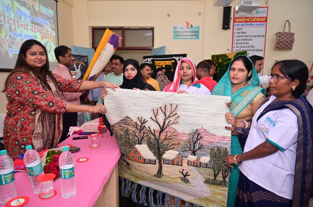 कहा कि महिलाओं को आत्मनिर्भर बनाने के लिए संस्था प्रतिबद्ध है। महिला सामूहिक रूप से जूट उद्यमी में कढ़ाई का कार्य करके अपनी आर्थिक स्थिति को सुदृढ़ कर सकती हैं। संस्था के निदेशक अजीत प्रसाद ने प्रशिक्षणार्थियों को स्वरोजगार से जुड़ने का अनुरोध किया। वहां पर उपस्थित महिला प्रशिक्षणार्थियों द्वारा जूट से बने वॉल हैंगिंग कैसर व अंग वस्त्र जहां अहमद के द्वारा जिलाधिकारी को भेंट किया गया। अग्रणी जिला प्रबंधक पीयूष सिंह परमार के द्वारा प्रशिक्षणार्थियों के जूट के बने सामान की प्रशंसा की गई और बैंक से होने वाली किसी भी समस्या का समाधान कराने का आश्वासन दिया गया। धन्यवाद ज्ञापन उप क्षेत्र प्रमुख आशीष कुमार के द्वारा सभा में उपस्थित सभी सदस्यों को ज्ञापित किया गया। कार्यक्रम के समाप्ति के उपरांत वृक्षारोपण आरसेटी परिसर में जिलाधिकारी द्वारा किया गया। कार्यक्रम की अध्यक्षता एवं संचालन संकाय मुकेश कुमार श्रीवास्तव ने किया। इस मौके पर संकाय लक्ष्मीकांत तिवारी, कार्यालय सहायक अभिषेक सिंह एवं पंकज शर्मा आदि उपस्थित रहे।