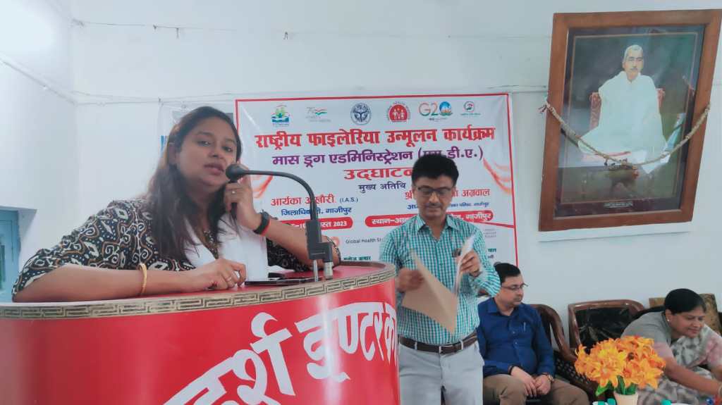 गाज़ीपुर। जिलाधिकारी आर्यका अखौरी एवं नगर पालिका परिषद अध्यक्ष सरिता अग्रवाल ने राष्ट्रीय फाइलेरिया उन्मूलन कार्यक्रम के तहत बृहस्पतिवार को फाइलेरिया सामूहिक दवा सेवन (एमडीए) अभियान का शुभारंभ महुआबाग स्थित आदर्श इंटर कॉलेज से किया। सर्वप्रथम जिलाधिकारी ने फाइलेरिया से बचाव की दवा एल्बेण्डाज़ोल और डीईसी का सेवन किया। तत्पश्चात नगर पालिका परिषद अध्यक्ष सरिता अग्रवाल, जिला बेसिक शिक्षा अधिकारी/विद्यालय निरीक्षक हेमंत राव, प्रधानाध्यापक चंद्रदेव राम, संचारी रोगों के नोडल अधिकारी/अपर मुख्य चिकित्सा अधिकारी डॉ जेएन सिंह, जिला मलेरिया अधिकारी मनोज कुमार सहित अन्य अधिकारियों, शिक्षकों व बच्चों ने दवा का सेवन किया।