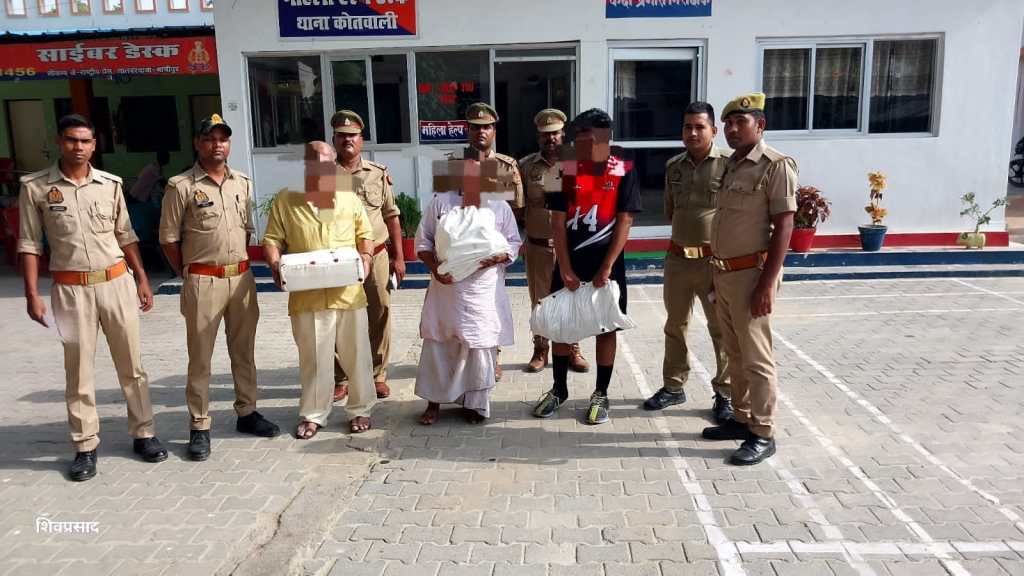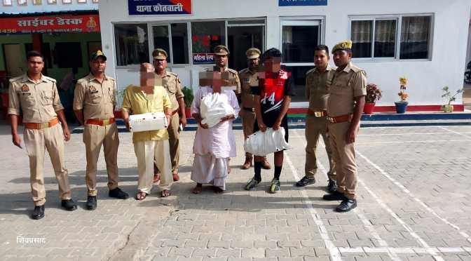 गाजीपुर। शहर थाना कोतवाली पुलिस द्वारा गोकशी करने वाले गिरोह के तीन लोगों को गिरफ्तार किया। उनके कब्जे से गौमांस, गौवंशीय चर्बी, गोवंशीय व पड़वा की खाल, अर्ध कटा मृत गोवंश, जीवित गोवंश, जीवित पड़वा, कुल्हाड़ी, चापड़, लोहे की चाकू, लकड़ी का ठीहा, बाट, तराजू, मोटर साइकिल, नगद रुपए एवं गोमांश बरामद हुआ। सोमवार को थाना कोतवाली कोतवाली प्रभारी तेज बहादुर सिंह व स्वाट टीम प्रभारी रामाश्रय राय की टीम द्वारा मुखबिर की सूचना पर थाना कोतवाली के सराय जेर किला क्षेत्र से तीन अभियुक्त शकील कुरैशी उर्फ मुन्ना पुत्र अब्दुल जलील निवासी सराय गली जेर किला थाना कोतवाली, मुख्तार कुरैशी पुत्र अब्दुल जलील निवासी सराय गली जेर किला थाना कोतवाली एवं शाद शेख उर्फ लक्की पुत्र शमीम शेख निवासी गोराबाजार थाना कोतवाली को गिरफ्तार किया गया। गिरफ्तार अभियुक्त के कब्जे से 3 कुन्तल गौमांस, 1 कुन्तल गौवंशीय चर्बी, 170 गोवंशीय व पड़वा की खाल, 1 अर्ध कटा मृत गोवंश, 3 जीवित गोवंश, 9 जीवित पड़वा, 2 कुल्हाड़ी, 2 चापड़, 4 लोहे की चाकू, 5 लकड़ी का ठीहा, 8 बाट, 2 तराजू, 1 मोटर साइकिल एवं गोमांश बिक्री के 1200 रूपये नगद बरामद हुआ। गिरफ्तारी के दौरान शेष अभियुक्त मौके का फायदा उठाकर फरार हो गए। फरार अभियुक्त में चेलाल कुरैशी पुत्र मुख्तार कुरैशी निवासी सरायगली जेर किला थाना कोतवाली तथा इब्राहिम पुत्र अन्तू निवासी खुदाईपुरा थाना कोतवाली शामिल रहे।
