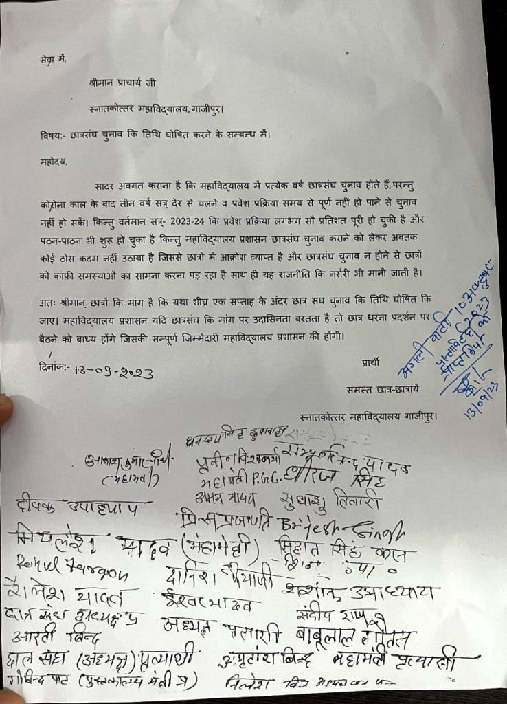 प्राचार्य द्वारा परीक्षा चलने कि वजह से लिखित तिथि दस अक्टूबर को एक बैठक बुलाई है। उसमें निर्णय लेंने की बात कही गई है।इस मौके पर छात्र नेता शशांक उपाध्याय, दीपक उपाध्याय, सिध्दांत सिंह “करन”, मनीष चौधरी, संदीप राय, सुधांशु तिवारी, बृजेश सिंह शेरू, सम्पूर्णानंद यादव, प्रवीण विश्वकर्मा, उजाला जायसवाल,शिवम उपाध्याय, अभिषेक द्विवेदी, नागेन्द्र कुशवाहा, मंजीत कुशवाहा, प्रद्युम्न सिंह यादव,किशन यादव,राजू पाण्डेय, राहुल यादव जरगो, शैलेश यादव, निखिल राज भारती,धीरज सिंह,आरती बिन्द,प्रिंस प्रजापति,आकाश चौधरी,निलेश बिन्द,अमृतांश बिन्द, धन्नजय कुशवाहा बाबू लाल गौतम, अभिषेक यादव, मिथिलेश यादव, सचिन यादव, गोविंद पाल इत्यादि सैकड़ों छात्र मौजूद थे।