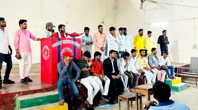 गाजीपुर। बुधवार को पीजी कॉलेज के सभागार में छात्रसंघ चुनाव कराने को लेकर सैकड़ों छात्र नेताओं ने एक बैठक किया। बैठक के पश्चात सभी ने चुनाव कराने को लेकर पत्रक प्राचार्य डॉ राघवेन्द्र पाण्डेय को सौंपा। छात्र नेताओं ने चुनाव कराने सम्बंधित मुद्दों पर चर्चा किया। तत्पश्चात सभी छात्रों ने प्राचार्य आफिस में प्राचार्य के समक्ष एक स्वर में मांग किया कि शीघ्र छात्र संघ चुनाव कि तिथि घोषित नहीं कि गयी तो छात्र आंदोलन पर बैठने को बाध्य होंगे जिसकी सम्पूर्ण जिम्मेदारी महाविद्यालय प्रशासन की होंगी।