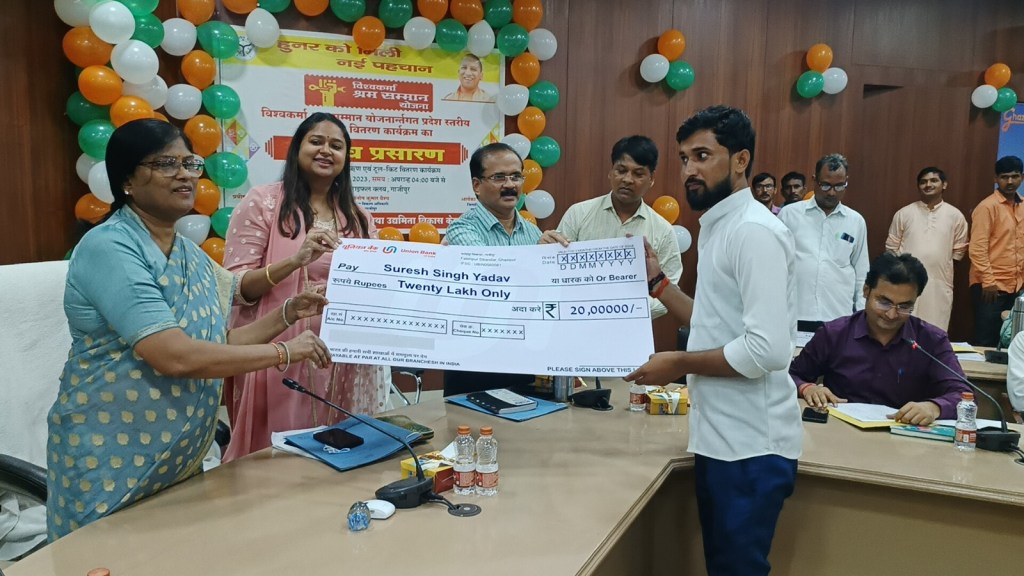 गाजीपुर। शासन द्वारा 17 सितम्बर को विश्वकर्मा दिवस के उपलक्ष्य में शनिवार को सायं 4 बजे से 5 बजे तक लोकभवन सभागार, लखनऊ में कार्यक्रम आयोजित किया गया जिसका शुभारम्भ मुख्यमंत्री द्वारा किया गया, जिसमें विश्वकर्मा श्रम सम्मान योजनान्तर्गत लाभार्थियों को दूल-किट एवं ऋण वितरण किया गया तथा कार्यक्रम का सजीव प्रसारण भी किया गया। जिसके क्रम में जिले स्तर पर जिलाधिकारी के निर्देशन में कार्यक्रम का सजीव प्रसारण उद्यमियों/लाभार्थियों एवं अधिकारियों द्वारा राइफल क्लब में अपराहन् 4 बजे से देखा एवं सुना गया। तत्पश्चात् सरिता अग्रवाल अध्यक्ष, नगर पालिका परिषद की अध्यक्षता में कार्यक्रम प्रारम्भ हुआ एवं अध्यक्ष के द्वारा विश्वकर्मा श्रम सम्मान योजनान्तर्गत विभिन्न ट्रेड के लाभार्थियों को टूलकिट एवं विभिन्न ऋण परक योजनाओं एम०वाई0एस00वाई० ओ०डी०ओ०पी० पी०एम०ई०जी०पी०, मुद्रा योजनाओं में उद्योगो हेतु बैंको द्वारा 50 लाभार्थियों को 4 करोड़ रूपये के ऋण का चेक वितरित किया गया। जिलाधिकारी द्वारा अपने सम्बोधन में परम्परागत कारीगरों को आगे बढ़ने एवं उनके सहयोग हेतु सम्बन्धित विभागों से पूर्ण सहयोग प्रदान कराने का आश्वासन दिया गया। कार्यक्रम में संतोष कुमार वैश्य मुख्य विकास अधिकारी, प्रवीण कुमार मौर्य, उपायुक्त उद्योग, पियूष सिंह परमार अग्रणी जिला प्रबन्धक, सभी बैंकों के जिला समन्वयक, अन्य बैंकों के शाखा प्रबन्धक विजय शंकर वर्मा, अध्यक्ष व्यापार मण्डल, गाजीपुर, अच्छेलाल कुशवाहा, व्यापार मण्डल के पदाधिकारी उद्यमी, लाभार्थी उपस्थित रहे।