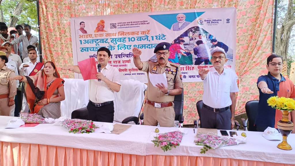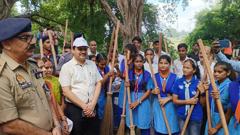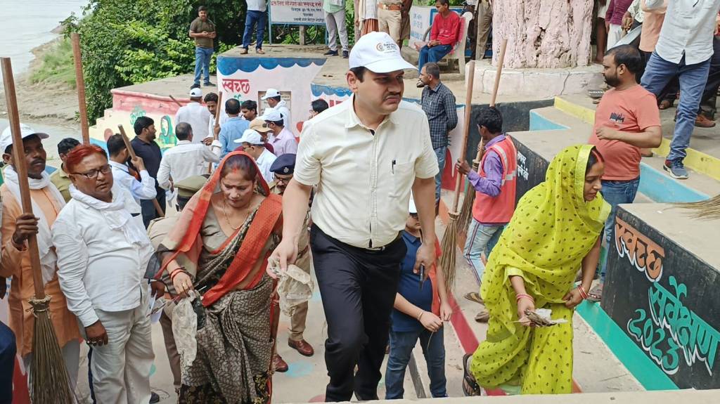 गाजीपुर। प्रधानमंत्री द्वारा राष्ट्रपिता महात्मा गाँधी को उनकी 154 जयंती की पूर्व संध्या पर स्वच्छांजली अर्पित करने के उद्देश्य से 1 अक्टूबर 2023 को सुबह 10 बजे सभी नागरिकों द्वारा सामूहिक रूप से स्वच्छता के लिए 1 घंटे के श्रमदान का आवाहन किया गया है। जिसके क्रम में रविवार को स्वच्छता ही सेवा पखवाड़ा के अंतर्गत एक तारीख, एक घंटा स्वच्छता के लिए जनपद के विभिन्न स्थलो व समस्त शासकीय कार्यालयों में साफ-सफाई किया गया। इसी क्रम में नगर पंचायत सैदपुर के वार्ड न. 3 रंगमहल घाट पर शासन द्वारा नामित नोडल अधिकारी मण्डलायुक्त वाराणसी मण्डल कौशल राज शर्मा ने ‘स्वच्छता ही सेवा-2023’ कार्यक्रम एवं कचरा मुक्त भारत अभियान के अन्तर्गत 1 अक्टूबर को श्रमदान कर ‘‘एक तारीख, एक घण्टा स्वच्छता के लिये’’ अभियान में प्रतिभाग करते हुए झाडू लगाया एवं कूड़े की सफाई किया। मण्डलायुक्त ने रंगमहल घाट पर पहुॅचकर साफ-सफाई अभियान में श्रमदान किया एवं उपस्थित नगरवासियों को स्वच्छता के प्रति शपथ दिलाई तथा नगर पंचायत सैदपुर मे अच्छे कार्य करने वाले सफाई कर्मचारियों को प्रशस्ति पत्र देकर सम्मानित किया। स्वच्छता अभियान में नगर पंचायत अध्यक्ष सैदपुर, पुलिस अधीक्षक ओमवीर सिंह, अपर जिलाधिकारी वि0रा0 अरूण कुमार सिंह, उपजिलाधिकारी सैदपुर, अधिशासी अधिकारी सैदपुर, प्राचार्य डायट, तहसीलदार सैदपुर, खण्ड विकास अधिकारी सैदपुर एवं स्थानीय नगरवासियों ने बढ़ चढ़ कर श्रमदान करते हुए झाडू एवं फावड़े के साथ घाट की साफ-सफाई की।