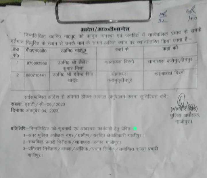 गाजीपुर। पुलिस अधीक्षक ओमवीर सिंह ने पुलिस विभाग में फेर बदल करते हुए दो उपनिरीक्षकों के कार्यक्षेत्र में बदवाल किया है। बिरनो थाना प्रभारी निरीक्षक शैलेश कुमार मिश्र को वहां से हटाकर करीमुद्दीनपुर थाना प्रभारी बनाया है। करीमुद्दीनपुर थाना प्रभारी देवेंद्र सिंह यादव को बिरनो थाना प्रभारी बनाया।
